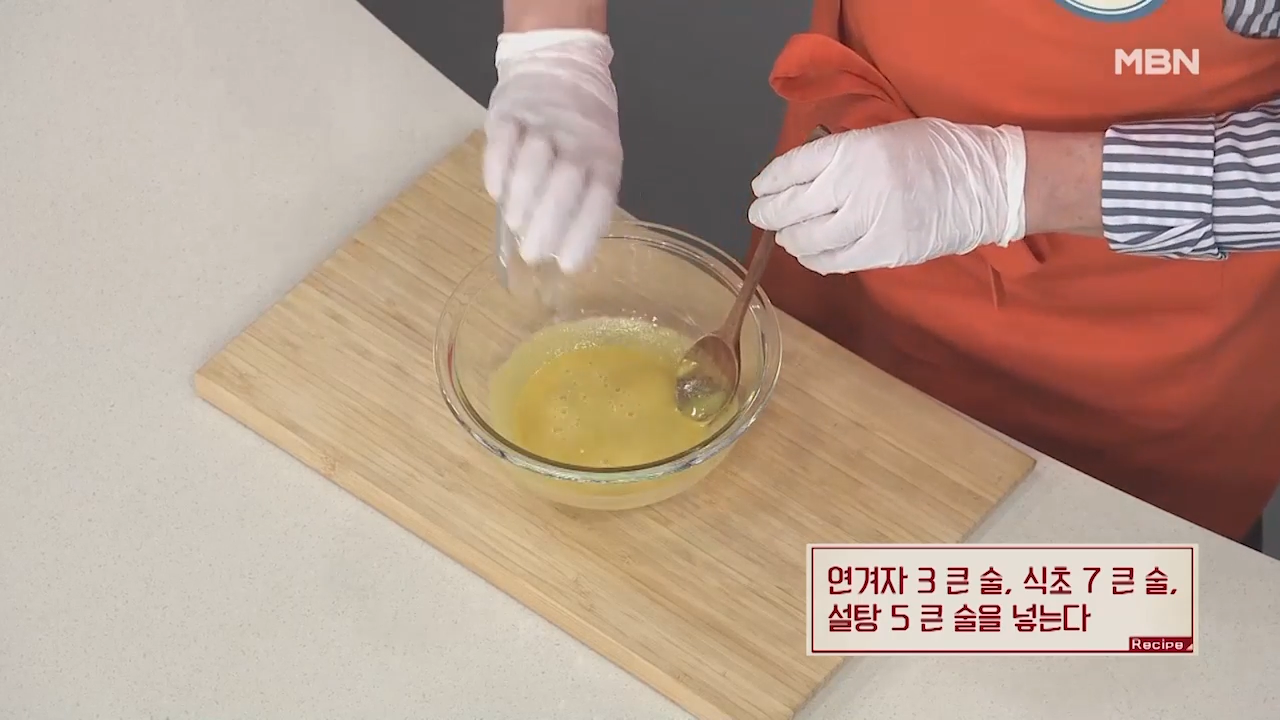 연겨자 3 큰술, 식초 7 큰술, 설탕 5큰술을 나누어 넣어 줍니다.