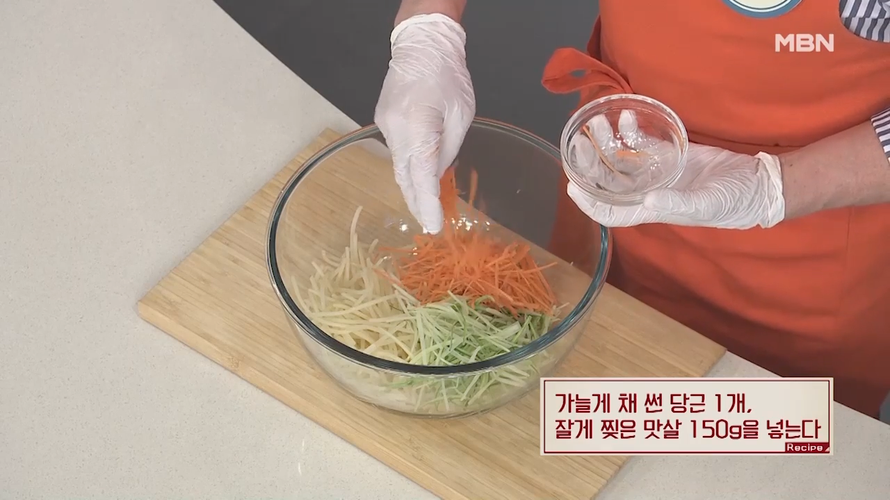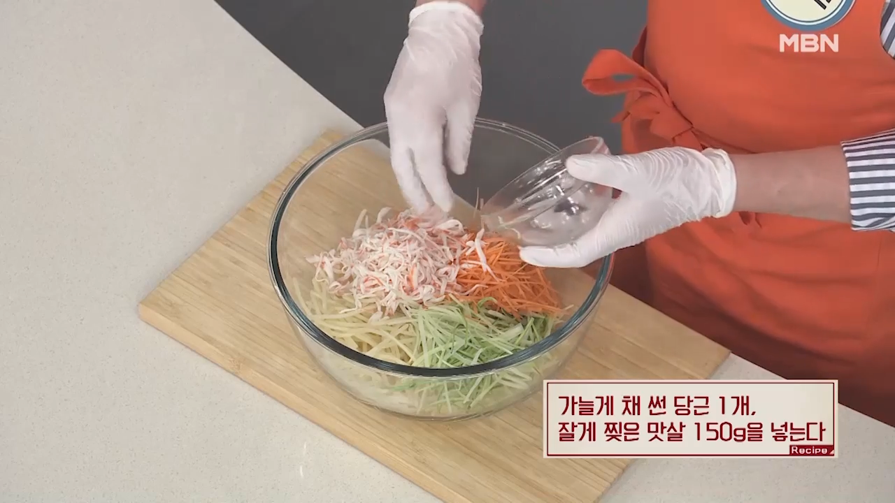 가늘게 채 썬 당근 1개, 잘게 찢은 맛살 150g을 넣어 잘 섞어 줍니다.