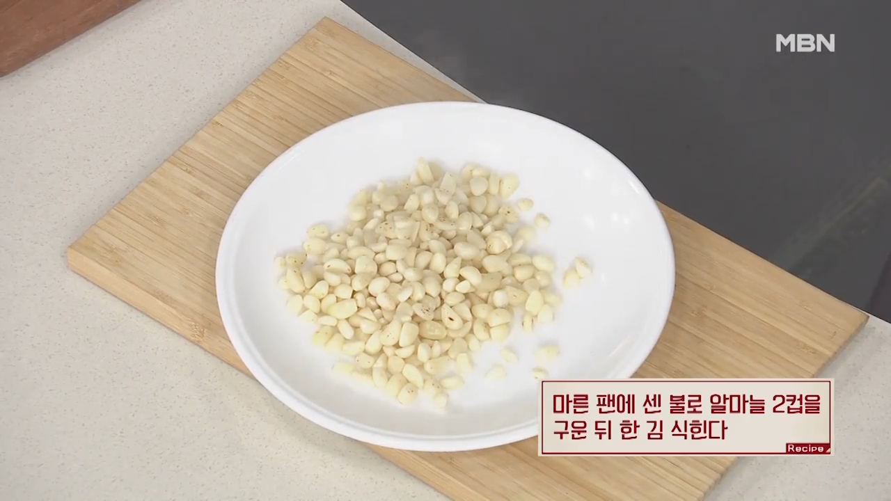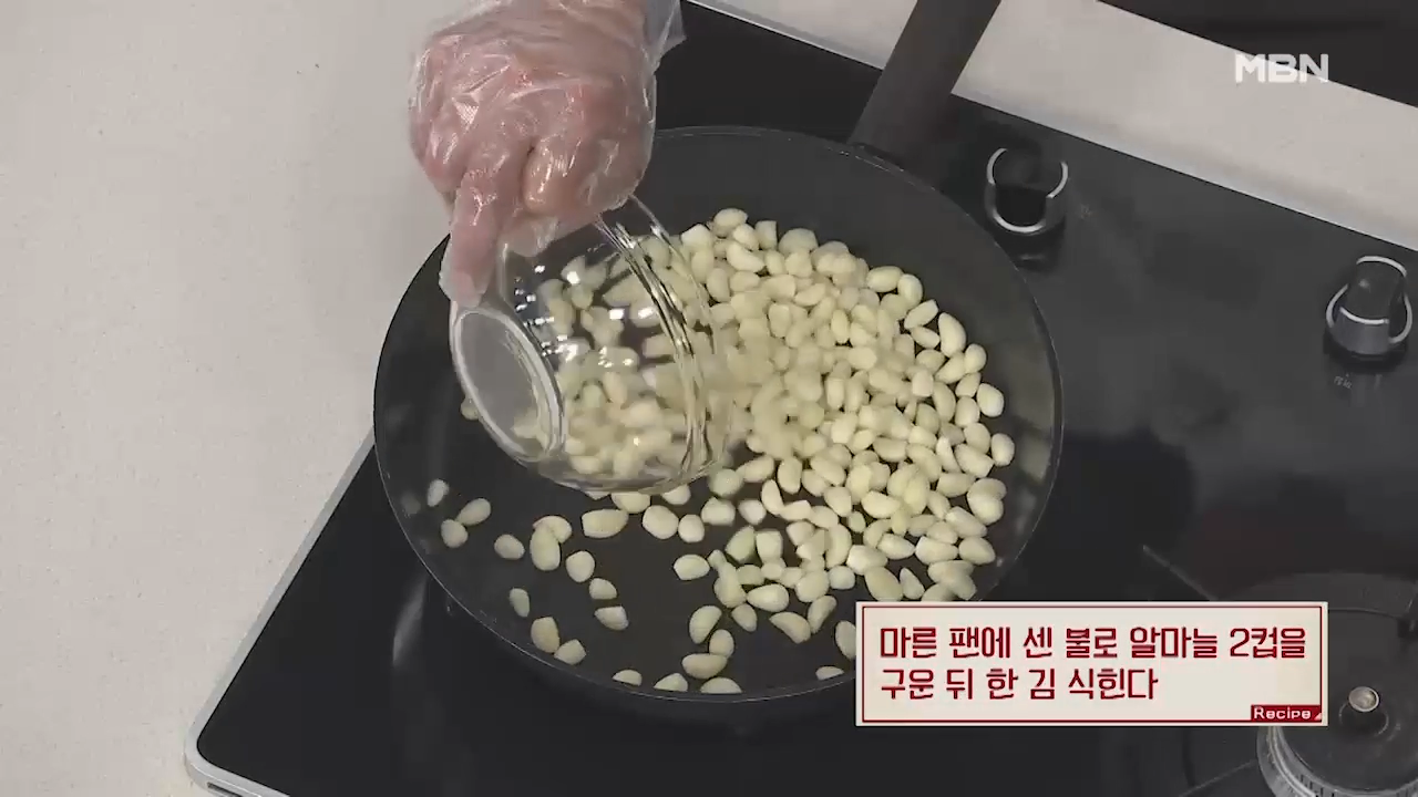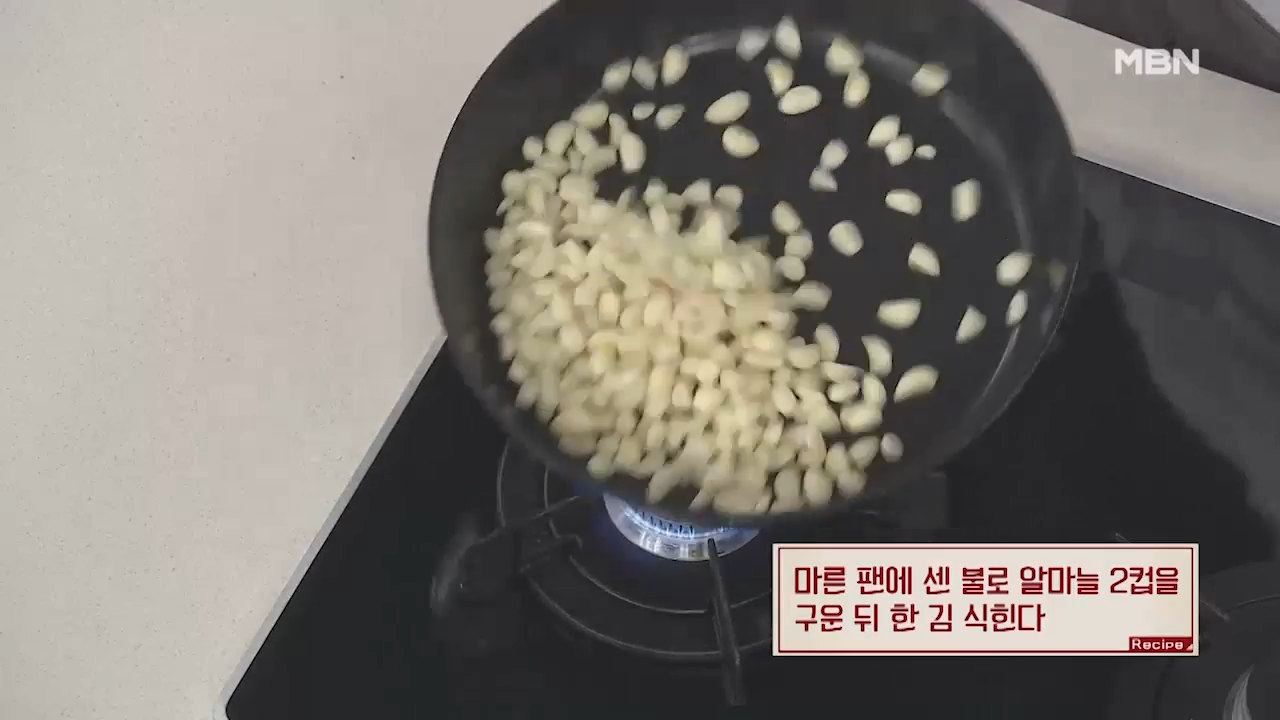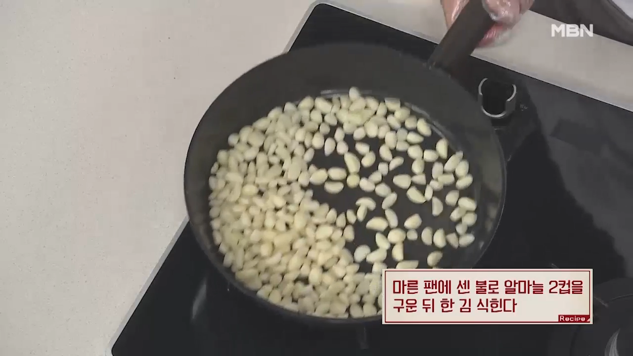 마른 프라이 팬에 알이 작은 마늘 2컵을 넣어줍니다.