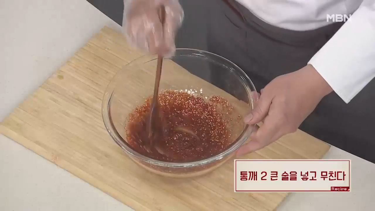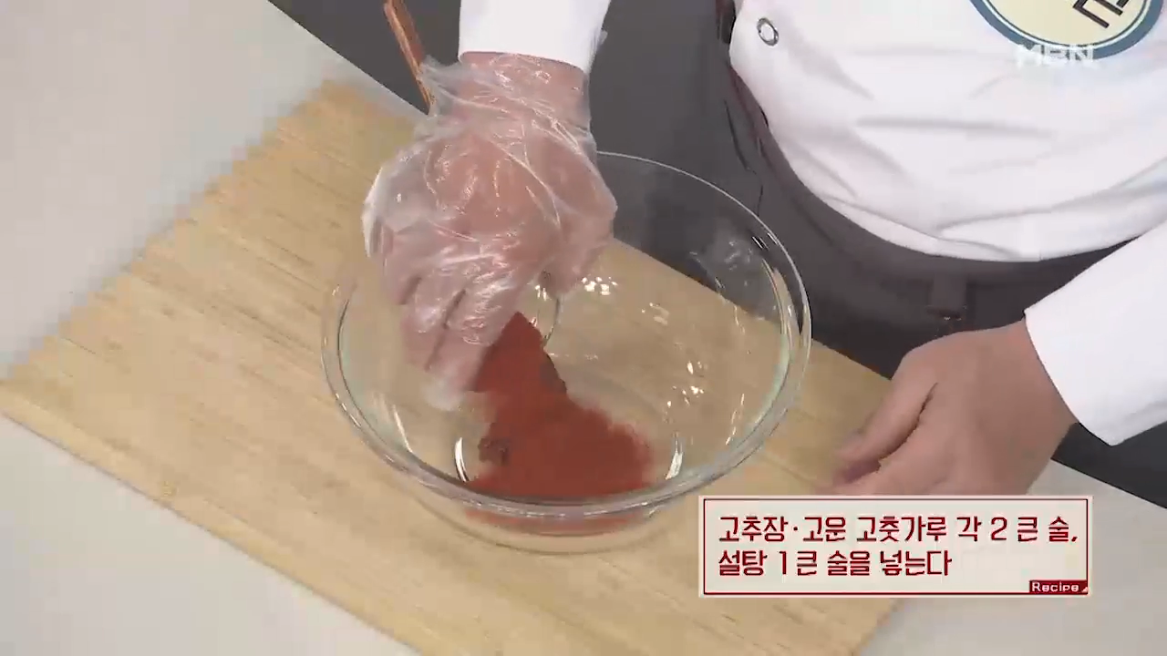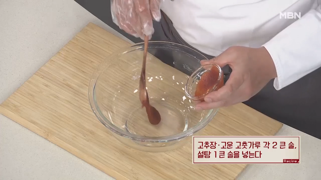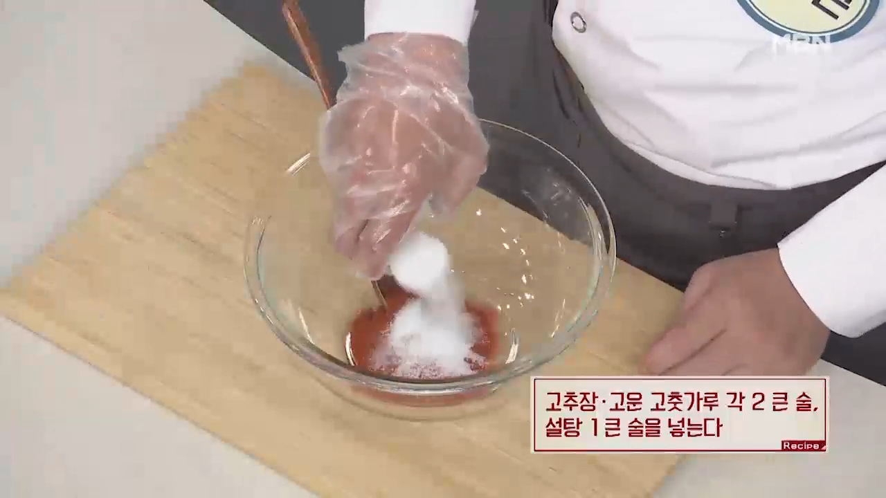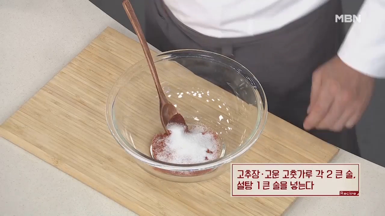 고추장 2큰술, 고운 고춧가루 2큰술, 설탕 1큰술을 넣어 줍니다.