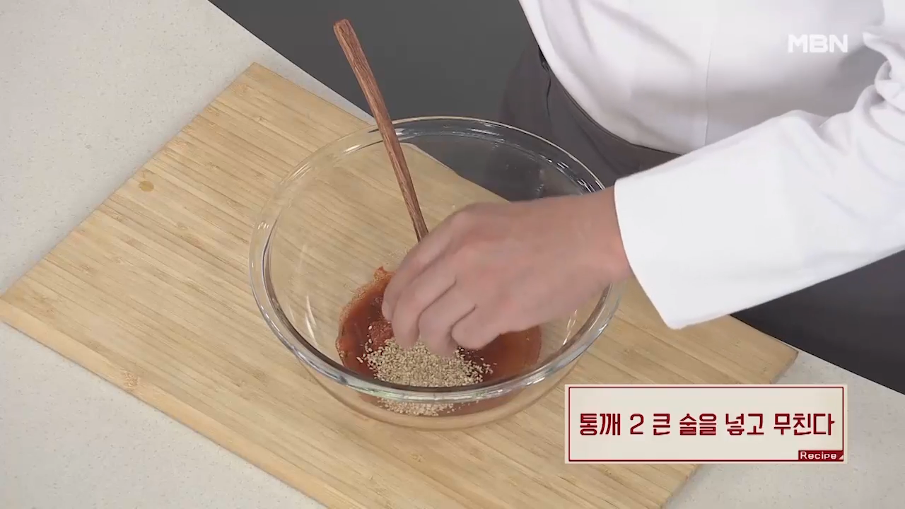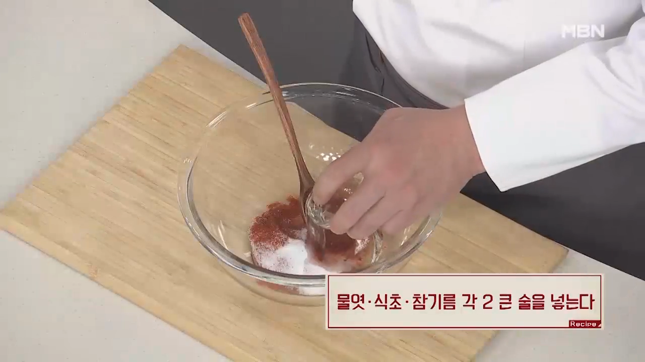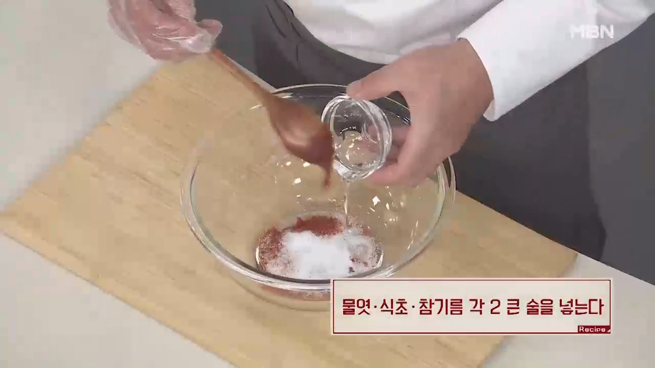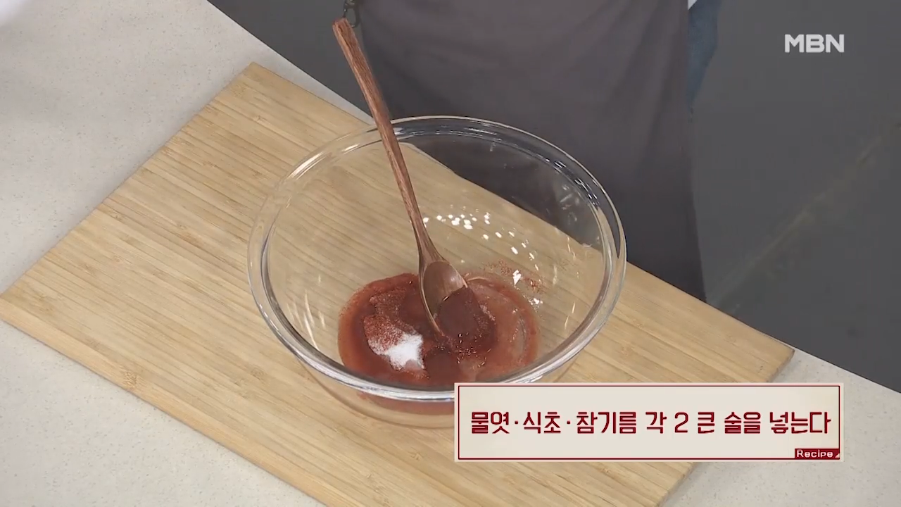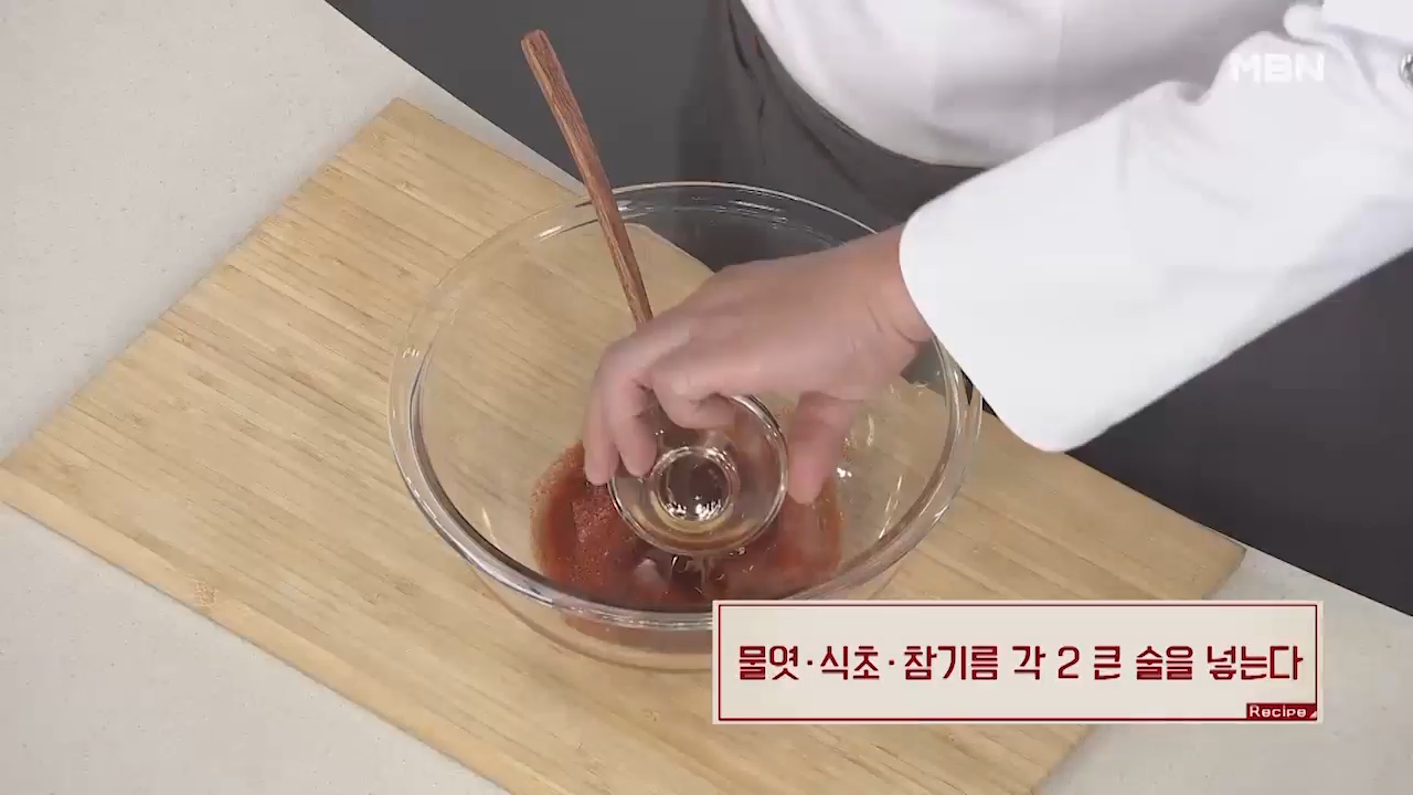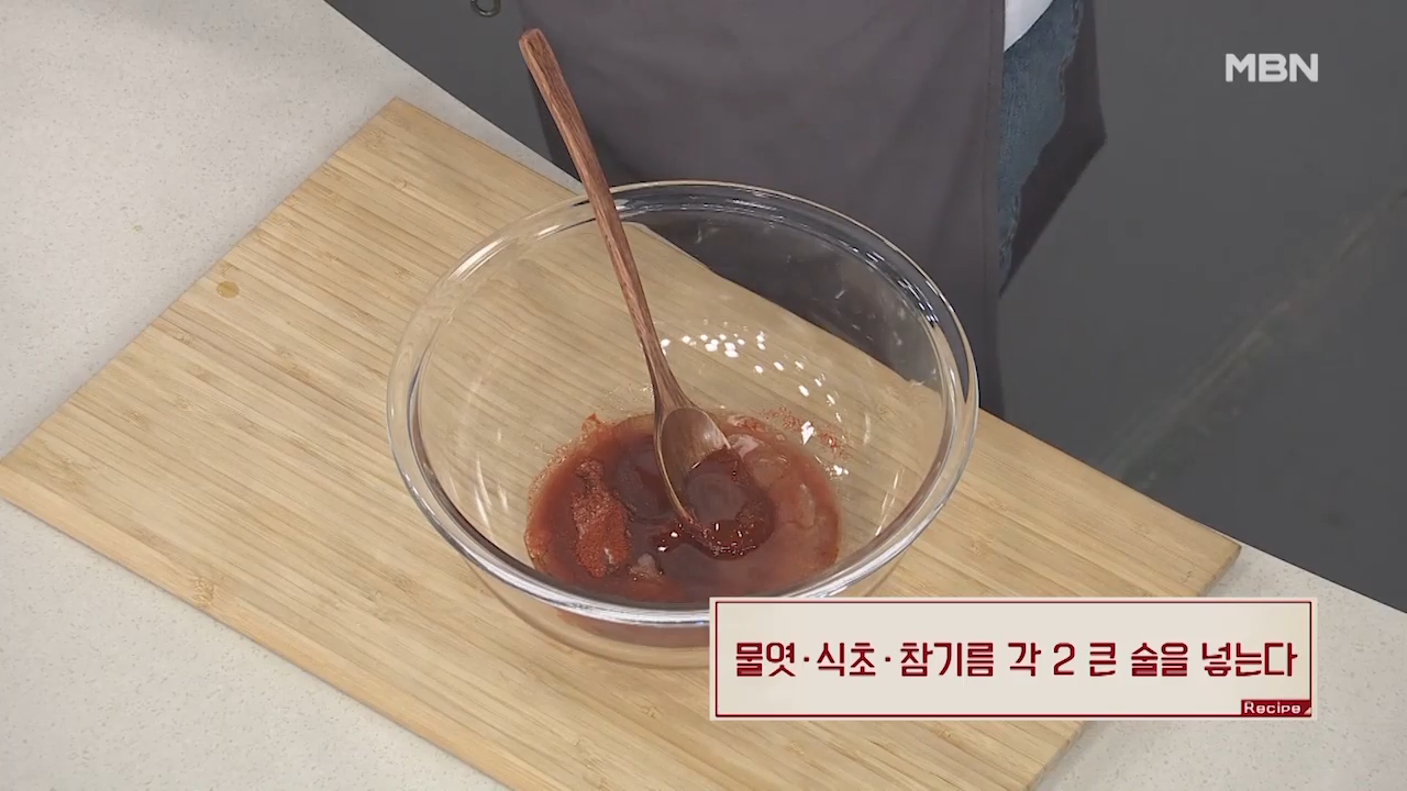 여기에 물엿 2큰술, 식초 2큰술, 참기름 2큰술을 넣어 줍니다.