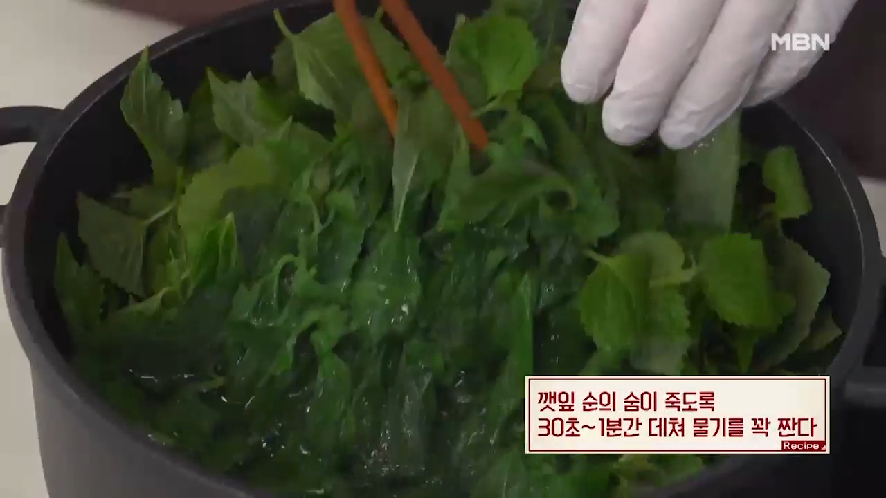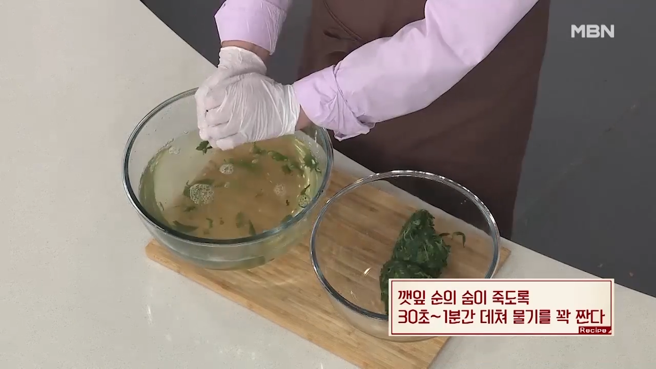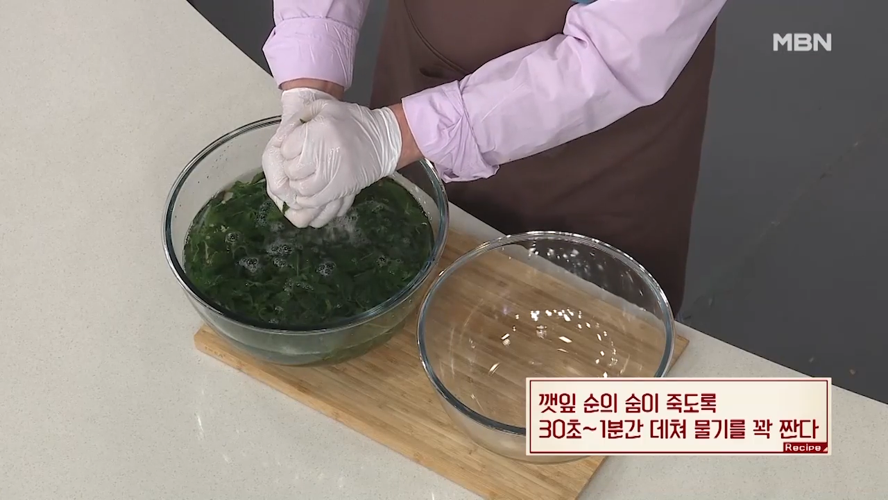 깻잎 순의 숨이 죽도록 30초~1분간 데쳐 물기를 꽉 짜줍니다.