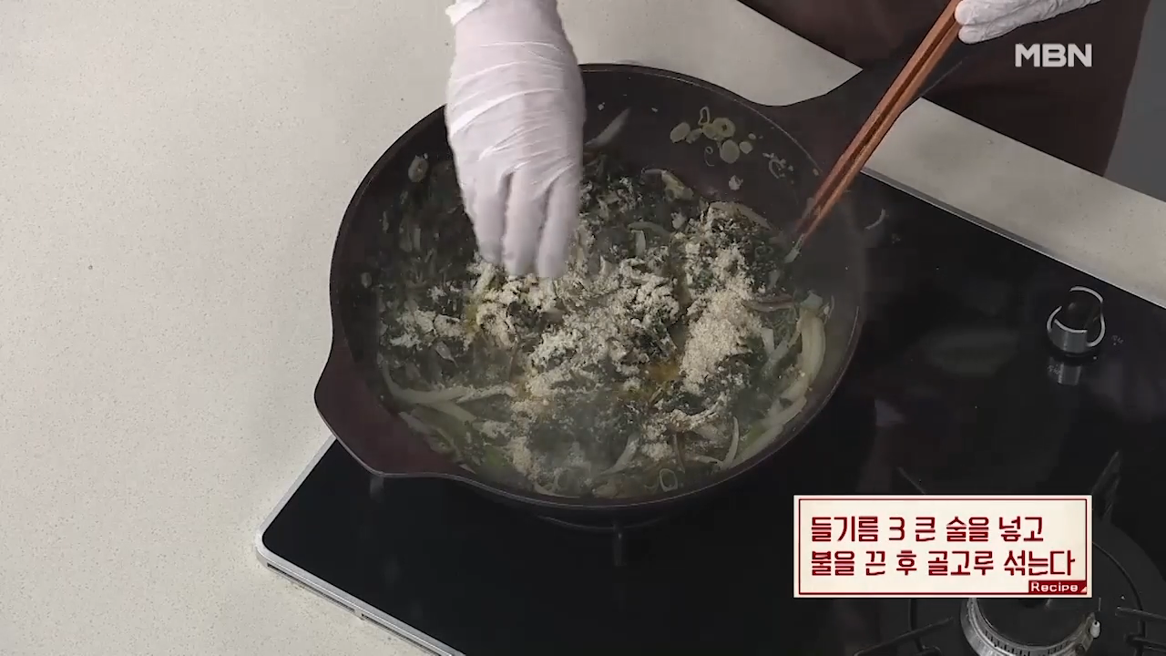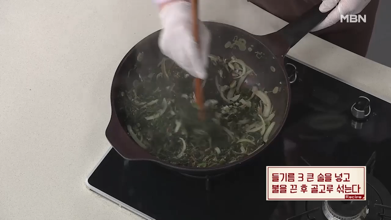 들기름 3큰술을 넣고 불을 끈 후 골고루 섞어 줍니다.