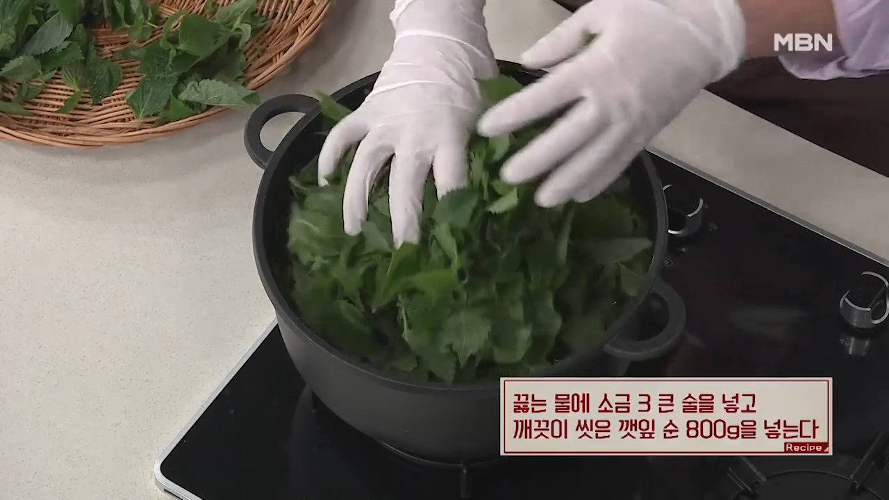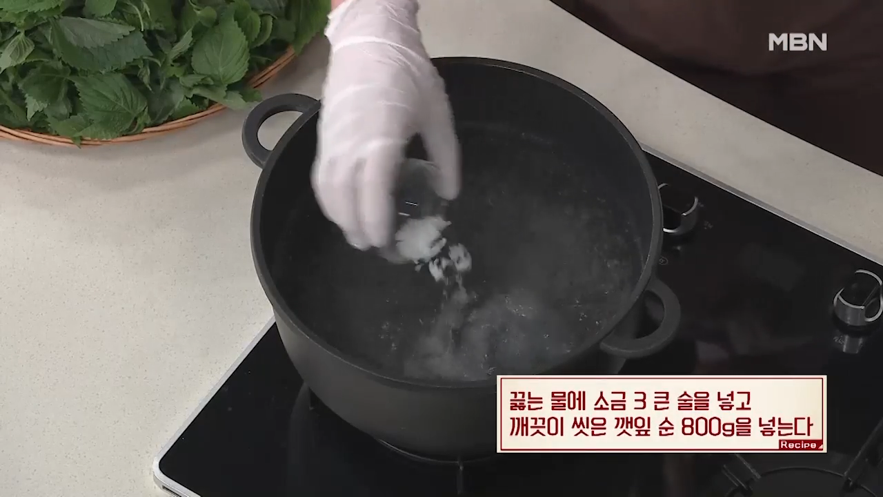 끓는 물에 소금 3큰술을 넣고 깨끗이 씻은 깻잎 순 800g을 넣어줍니다.