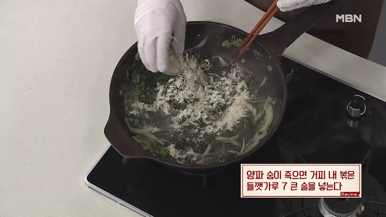 양파 숨이 죽으면 거피 내 볶은 들깻가루 7큰술을 넣어 줍니다.