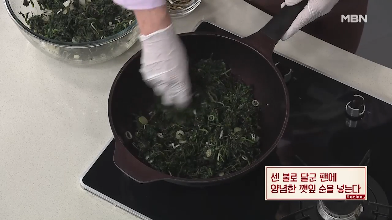 센 불로 달군 팬에 양념한 깻잎 순을 넣어 줍니다.