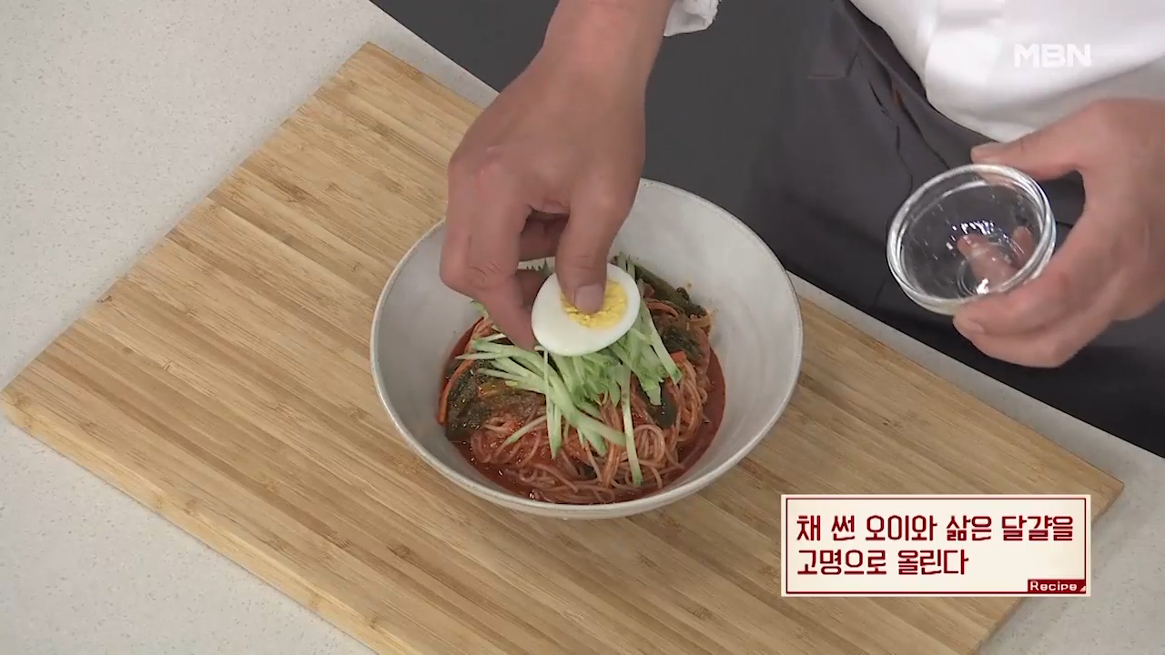 채 썬 오이와 삶은 달걀을 고명으로 올려줍니다.