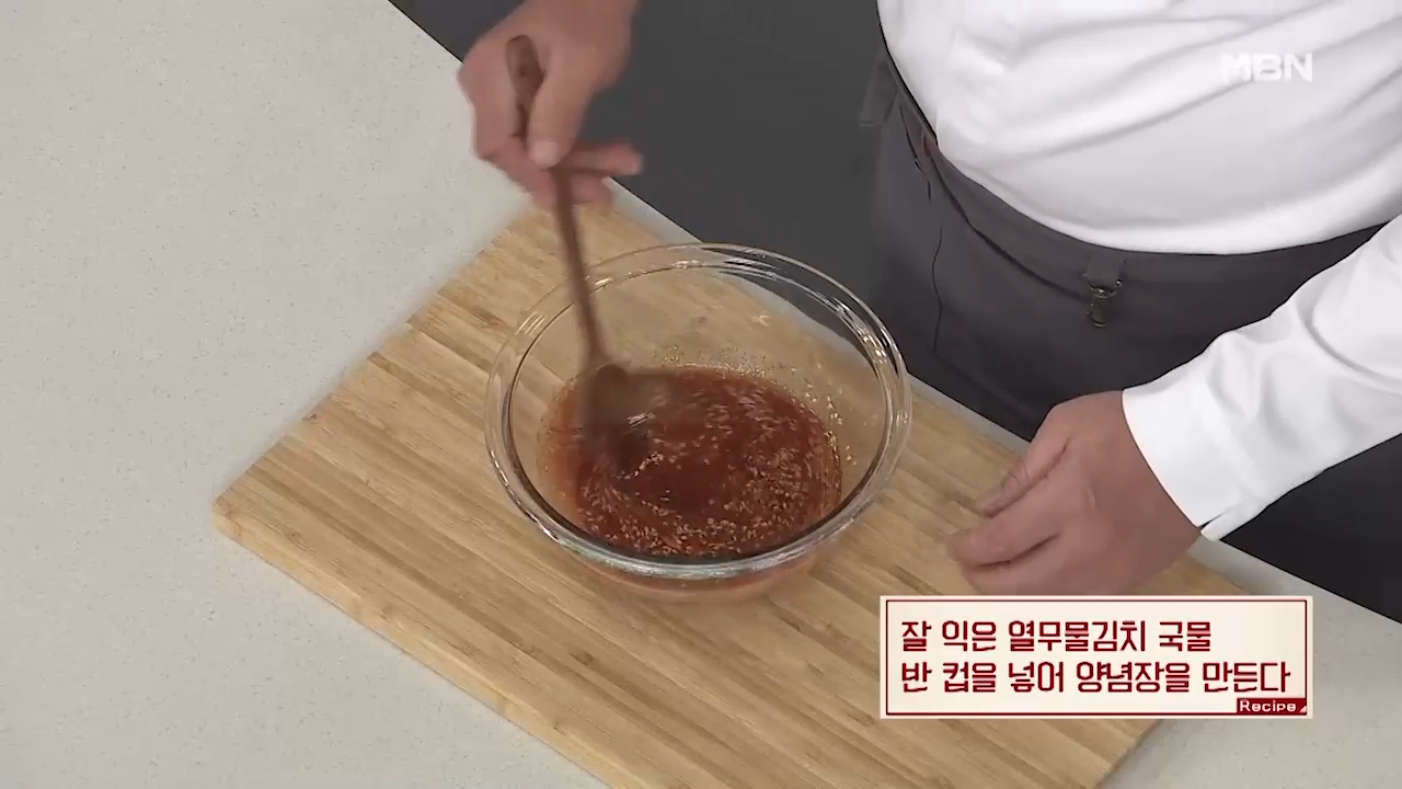 잘 익은 열무물김치 국물을 반 컵 넣어 양념장을 만들어 줍니다.