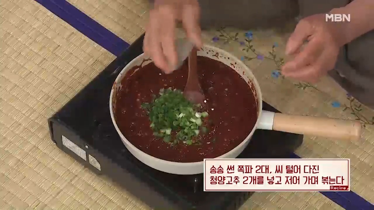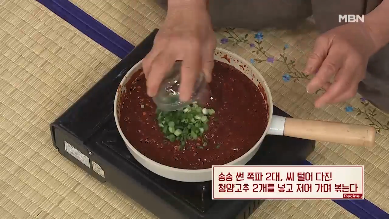 ▶송송 썬 쪽파 2대, 씨 털어 다진 청양고추 2개를 넣고 저어 가며 볶아 줍니다.