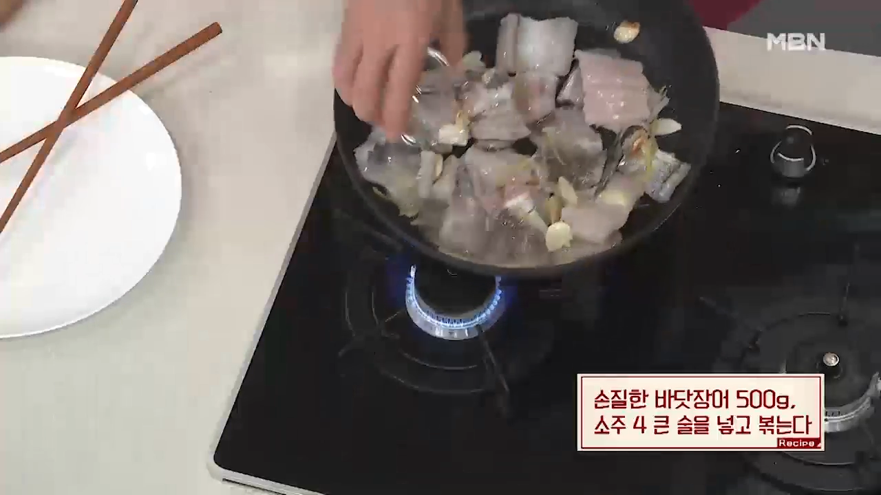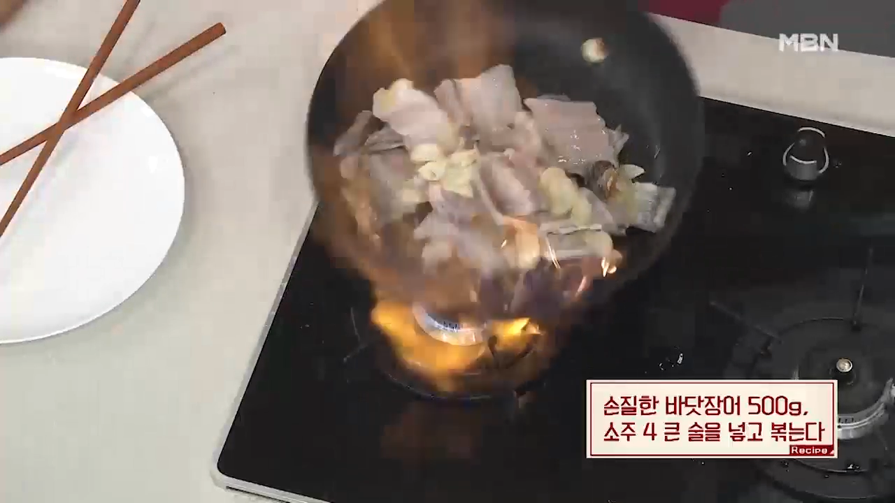 ▶손질한 바닷장어 500g, 소주 4큰술을 넣고 볶아줍니다.