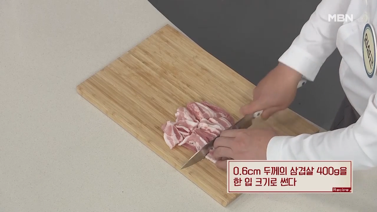 ▶0.6cm 두께의 삼겹살 400g을 한 입 크기로 썰어 줍니다.