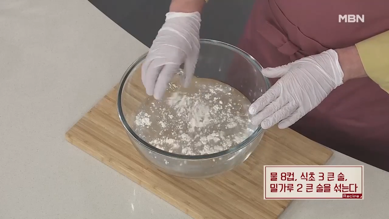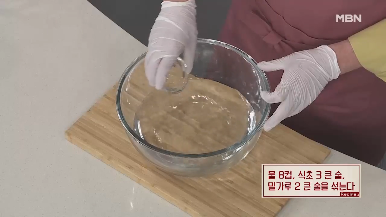 ▶물 8컵, 식초 3큰술, 밀가루 2큰술을 섞어 줍니다.
