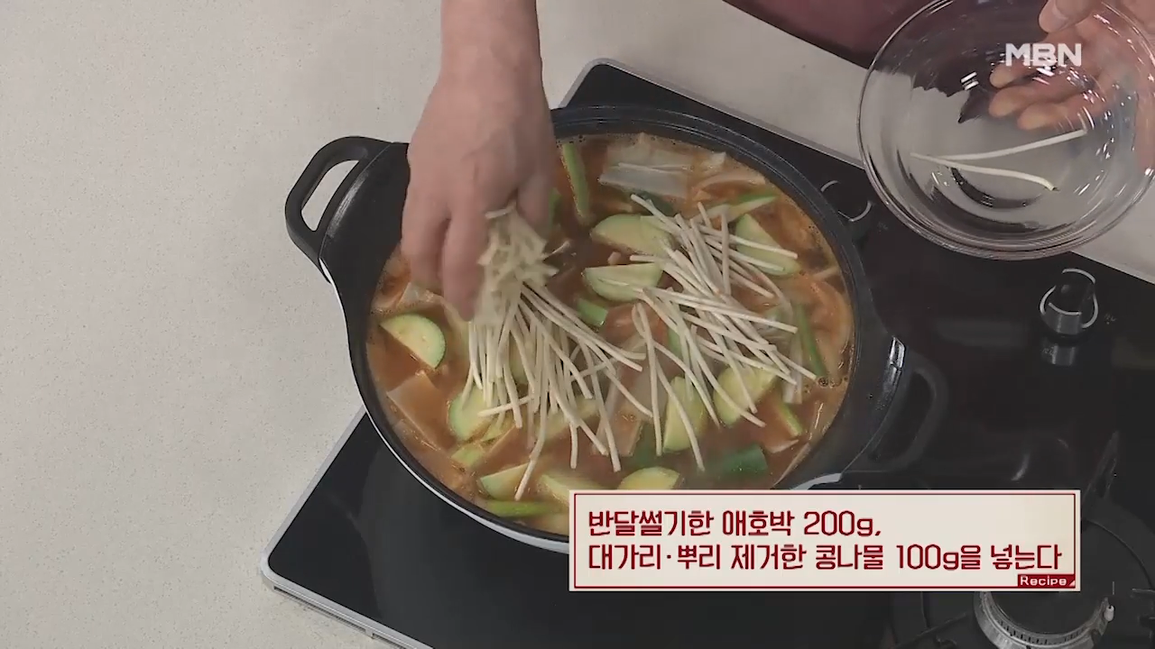 ▶반달 썰기한 애호박 200g, 대가리, 뿌리 제거한 콩나물 100g을 넣어줍니다.