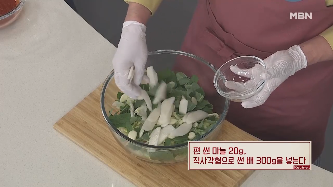 ▶편 썬 마늘 20g, 직사각형으로 썬 배 300g을 넣어 줍니다.