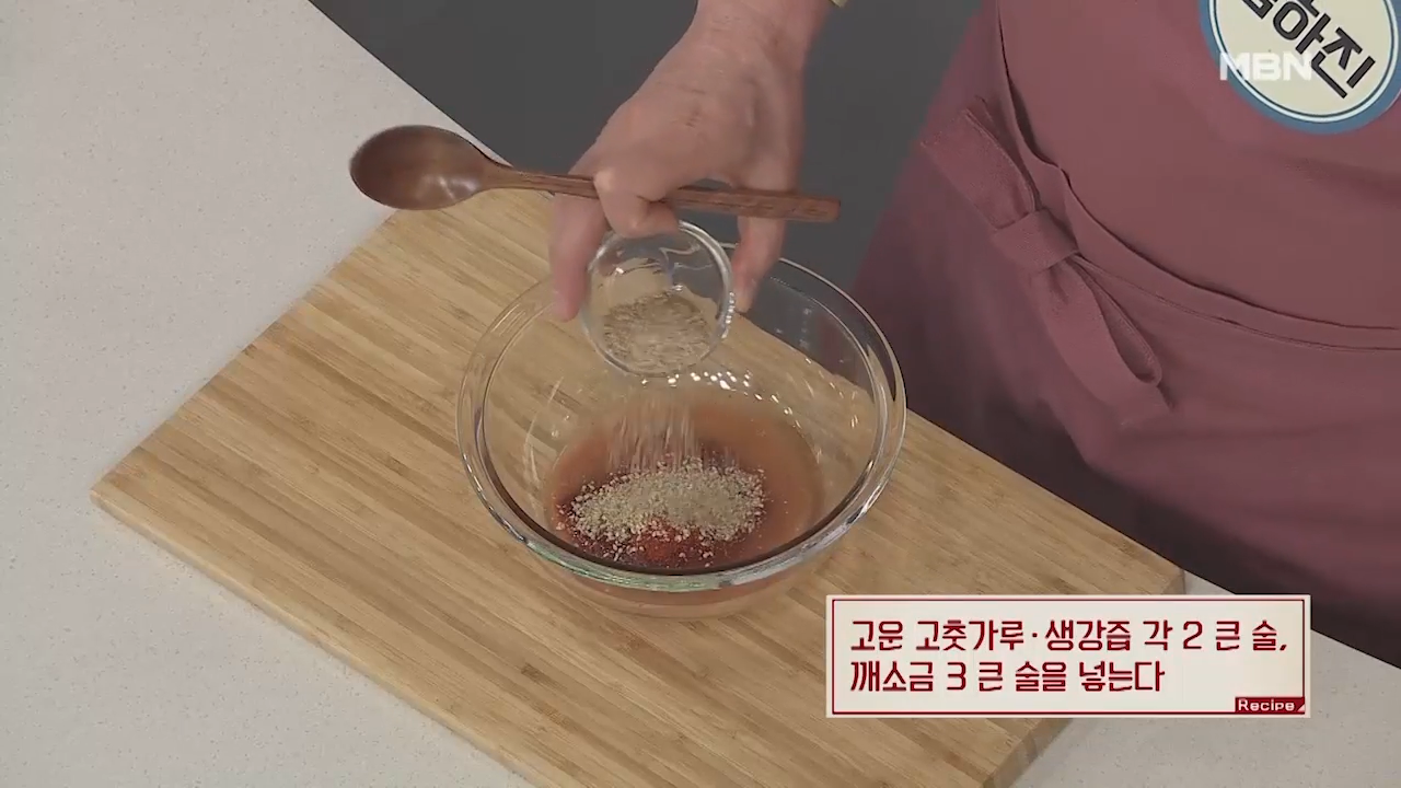 ▶고운 고춧가루, 생강즙 각 2큰술, 깨소금 3큰술을 넣어 줍니다.