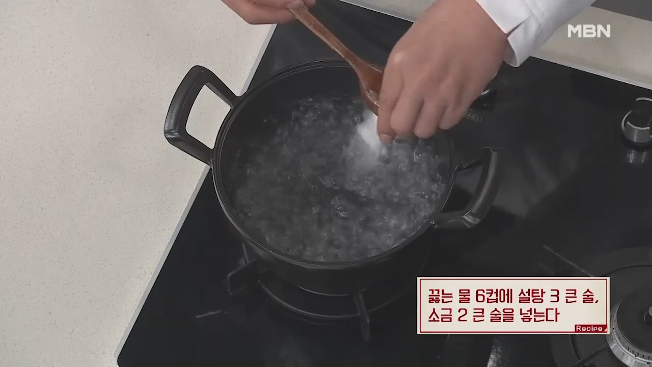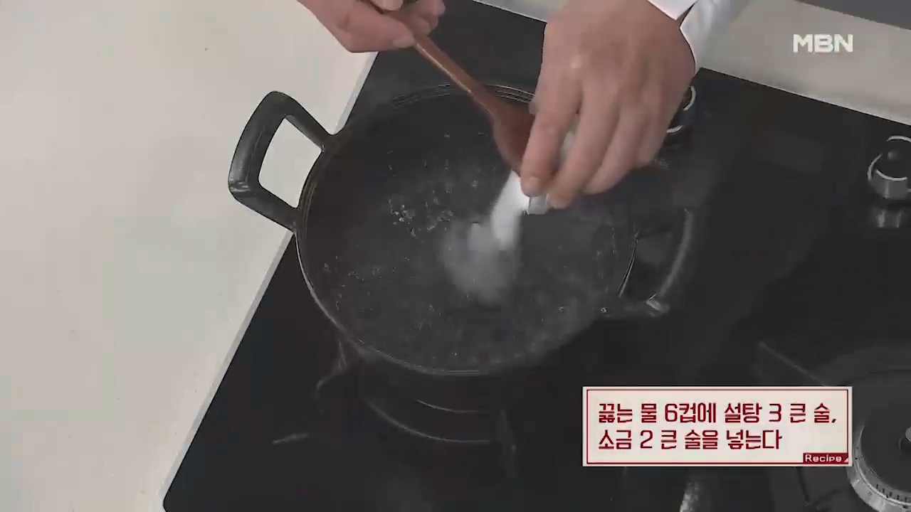 ▶끓는 물 6컵에 설탕 3큰술, 소금 2큰술을 넣어 줍니다.