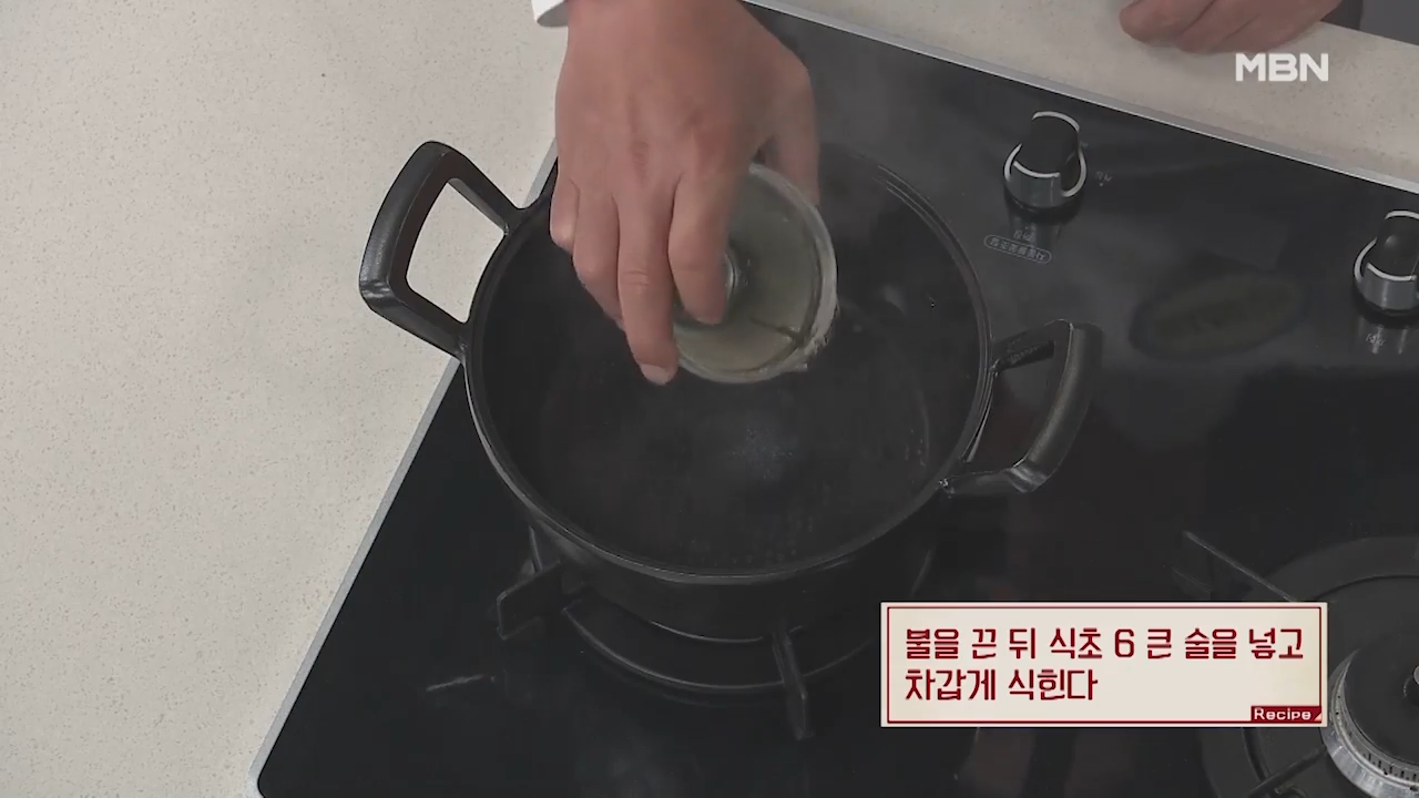 ▶불을 끈 뒤 식초 6큰술을 넣고 차갑게 식혀 줍니다.