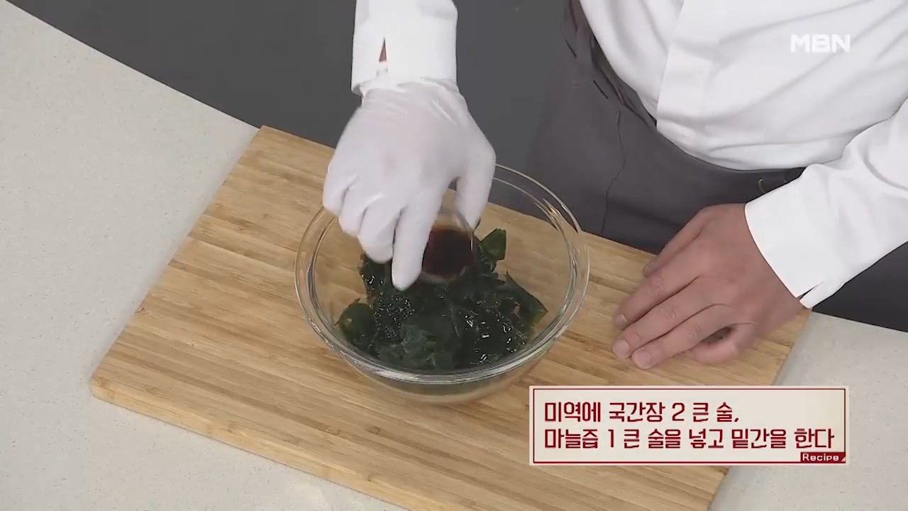 ▶미역에 국간장 2큰술, 마늘즙 1큰술을 넣고 밑간을 합니다.