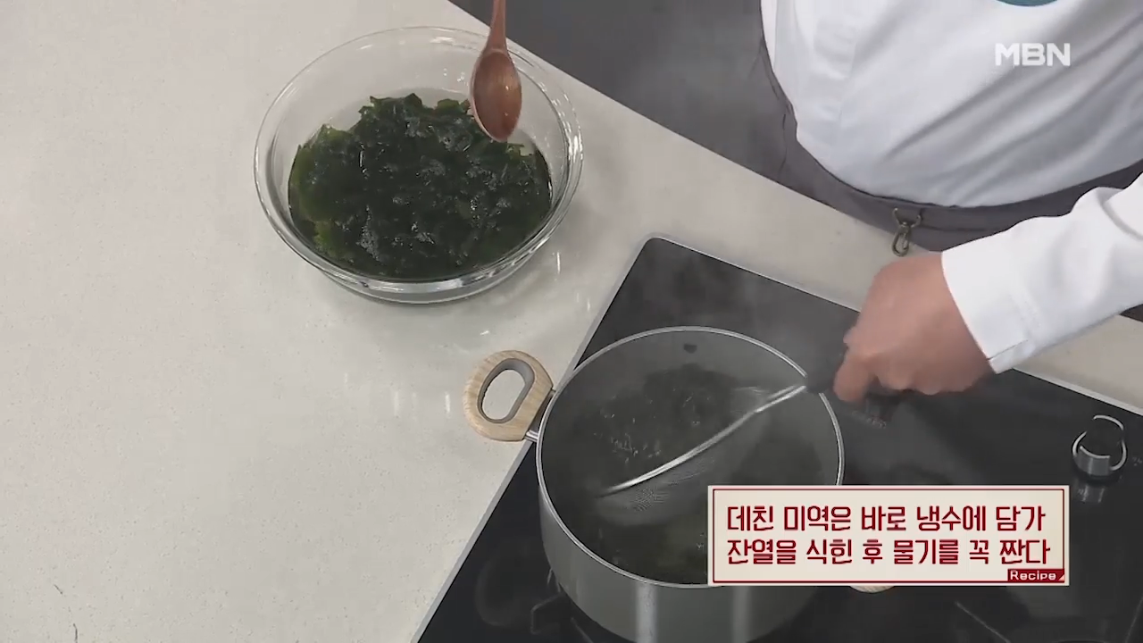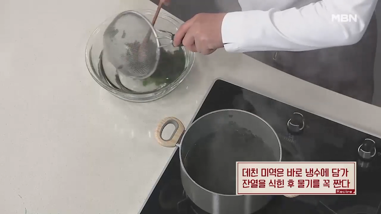 ▶데친 미역은 바로 냉수에 담가 잔열을 식힌 후 물기를 꼭 짜줍니다.