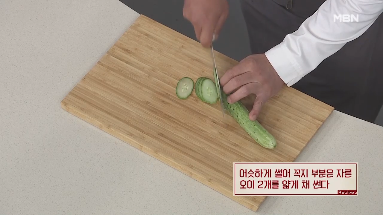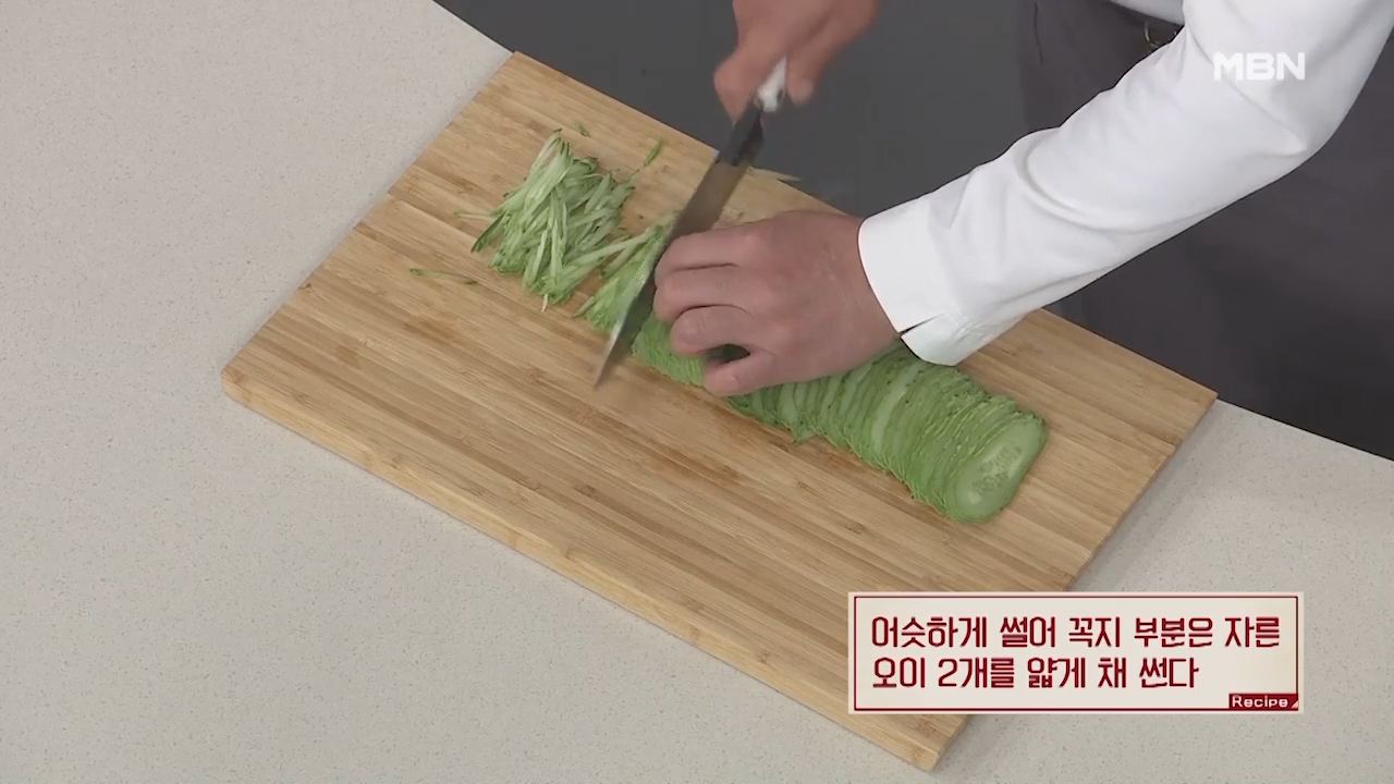 ※얇게 썬 오이 하나를 칼 옆면에 붙인 후 썰면 오이가 달라붙지 않습니다. 채소류는 밀면서 썰어야 맛과 식감이 유지됩니다.