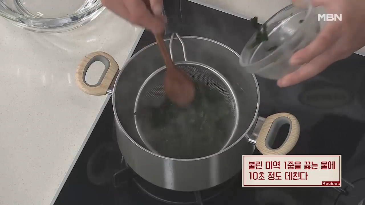 ▶불린 미역 1줌을 끓는 물에 10초 정도 데쳐 줍니다.