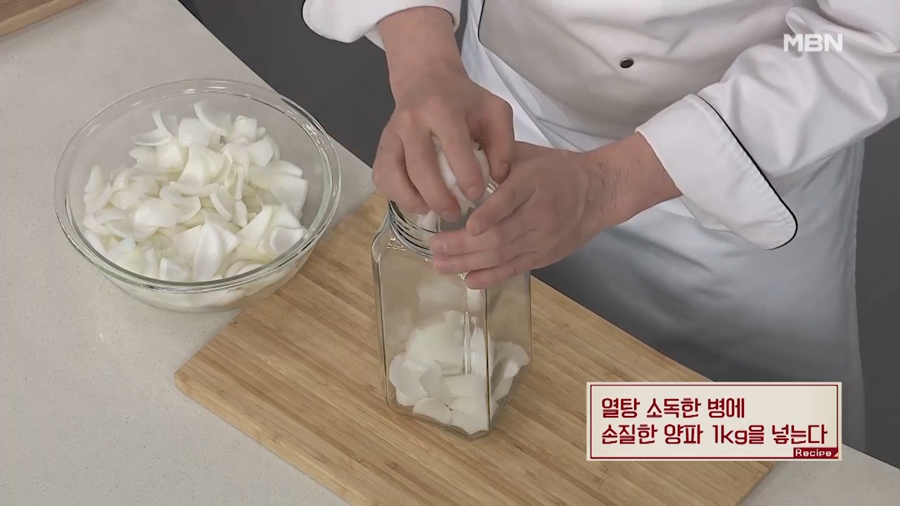 ▶열탕 소독한 병에 손질한 양파 1kg을 넣어 줍니다.