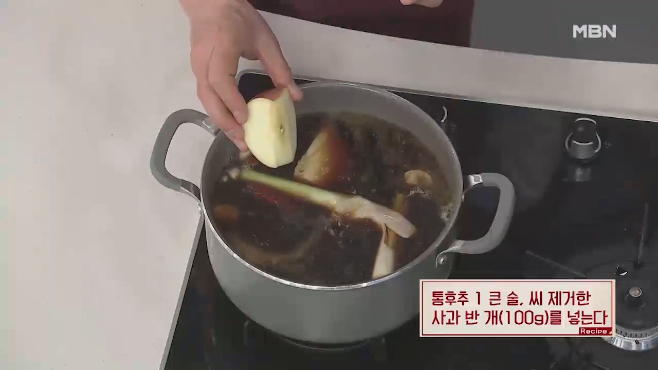 ▶통후추 1 큰술, 씨 제거한 사과 반 개 (100g)를 넣어 줍니다.