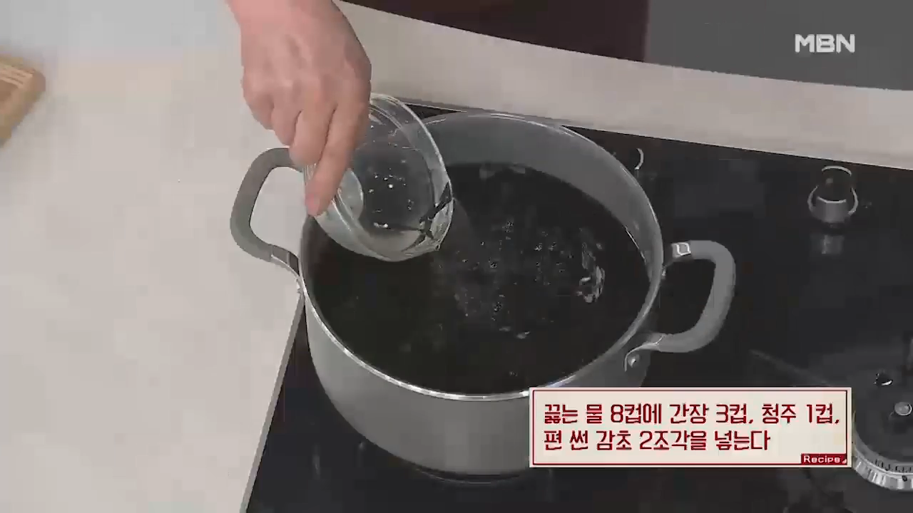 ▶끓는 물 8컵에 간장 3컵, 청주 1컵, 편 썬 감초 2조각을 넣어 줍니다.