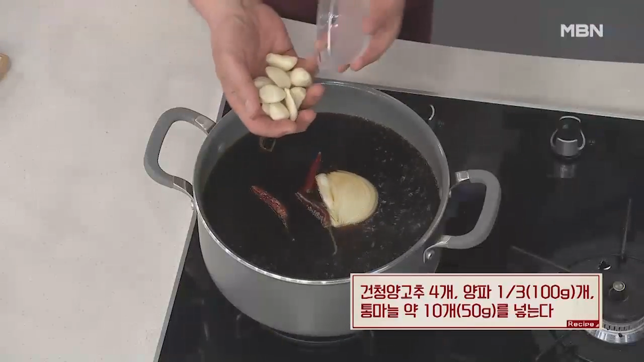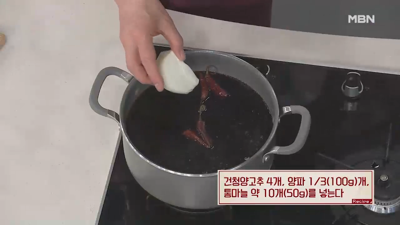 ▶건청양고추 4개, 양파 1/3(100g ) 개, 통마늘 약 10개(50g)를 넣어 줍니다.