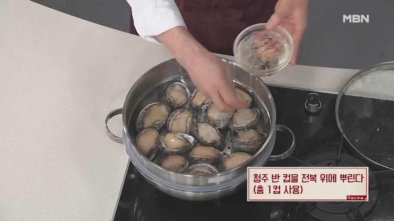 ▶청주 반 컵을 전복 위에 뿌려 줍니다. (총 1컵 사용)