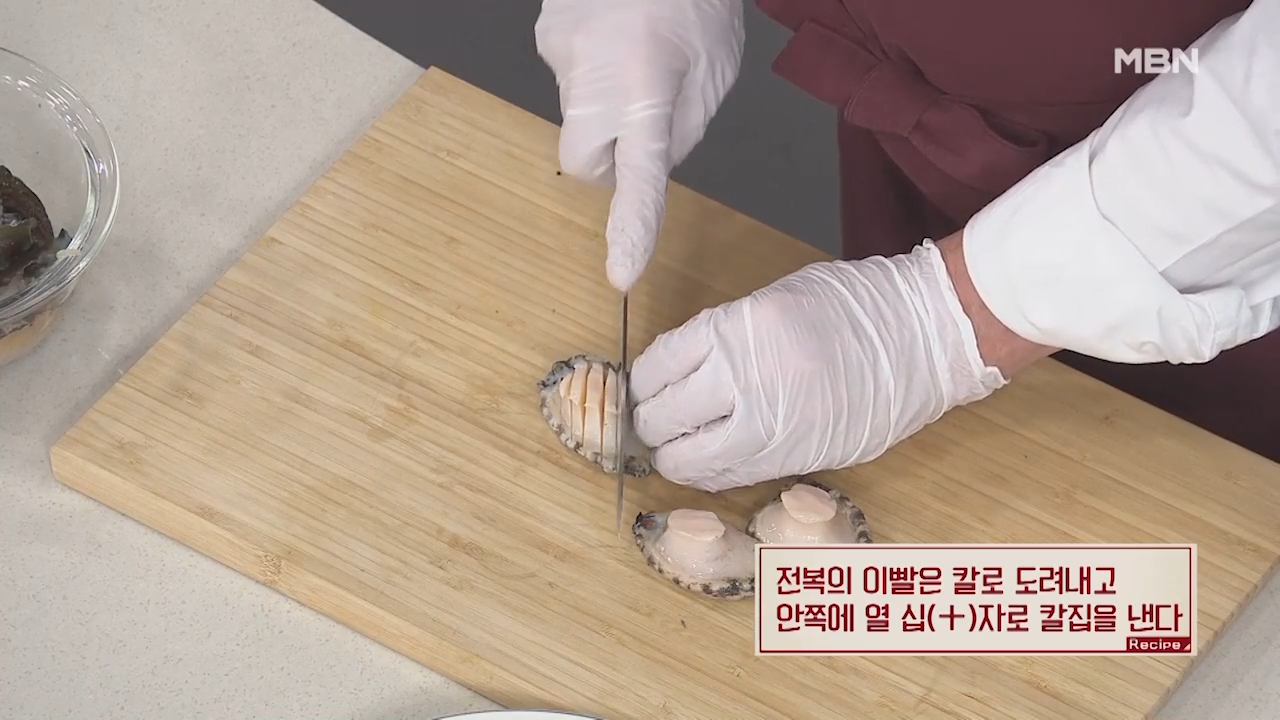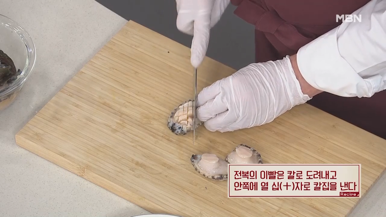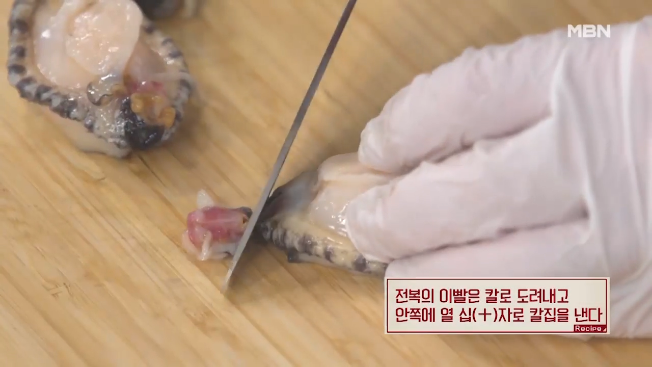 ▶전복의 이빨은 칼로 도려내고 안쪽에 열 십자(+)로 칼집을 내줍니다.