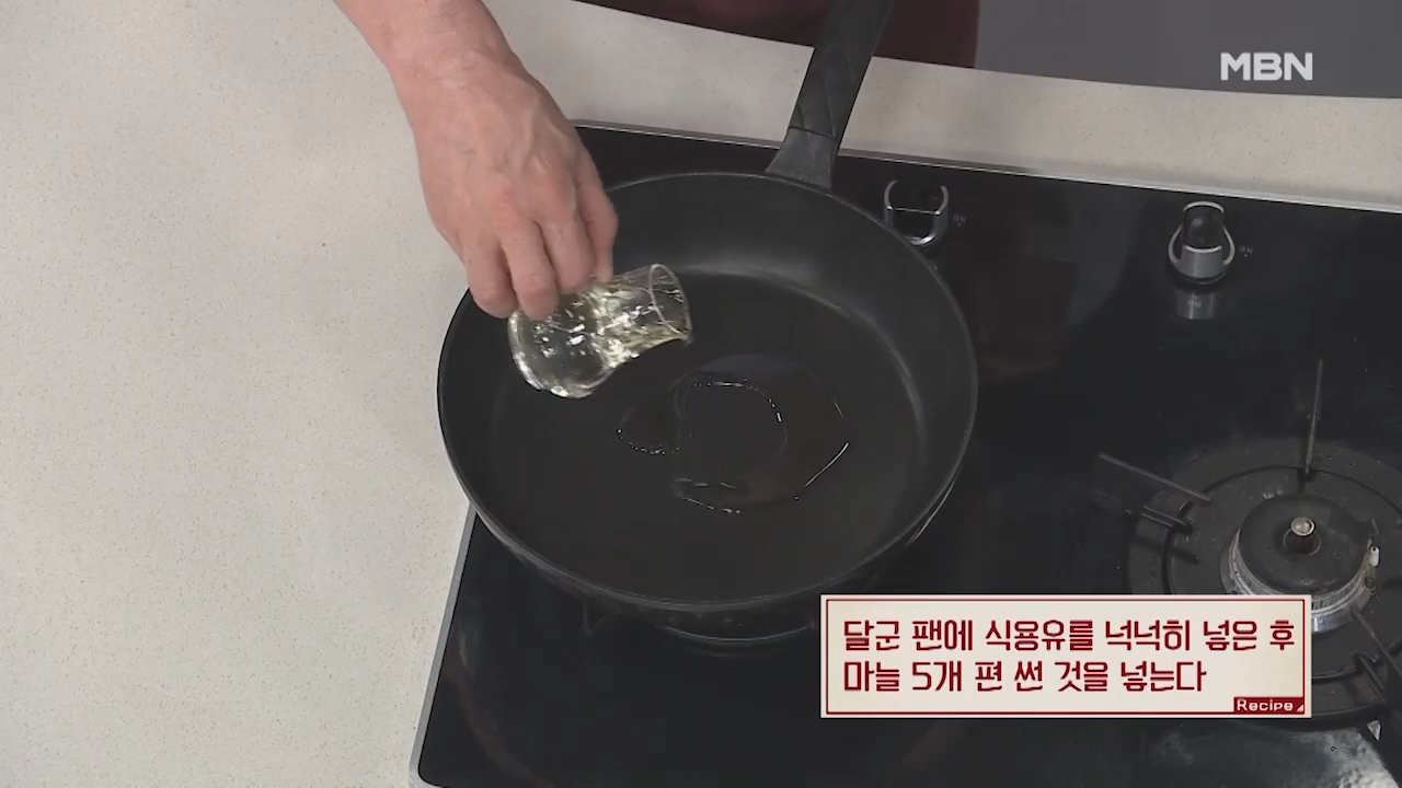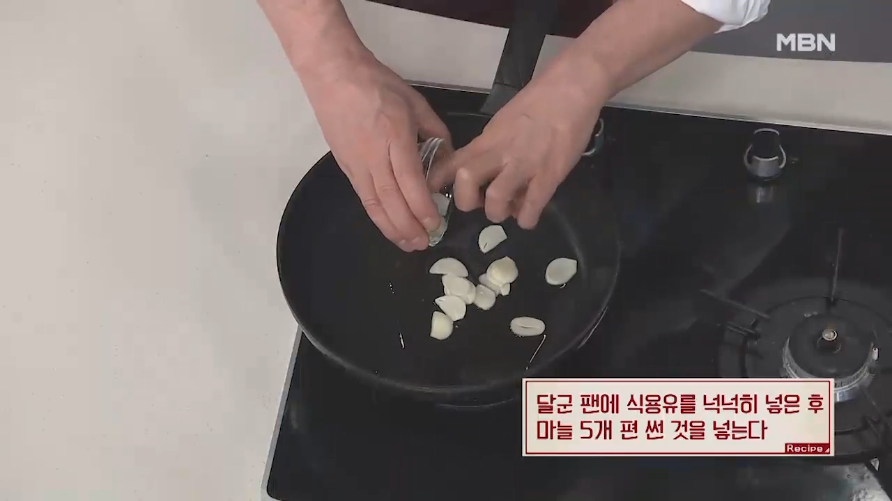 ▶달군 팬에 식용유를 넉넉히 넣은 후 마늘 5개 편 썬 것을 넣어 줍니다.