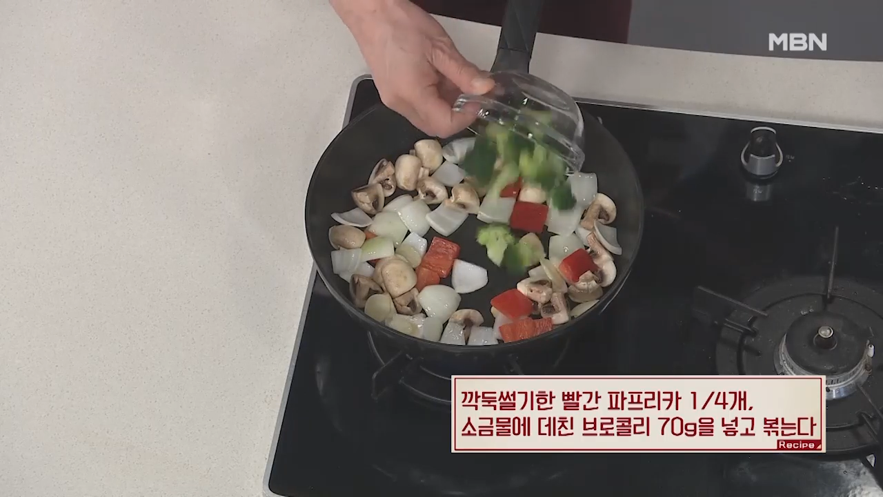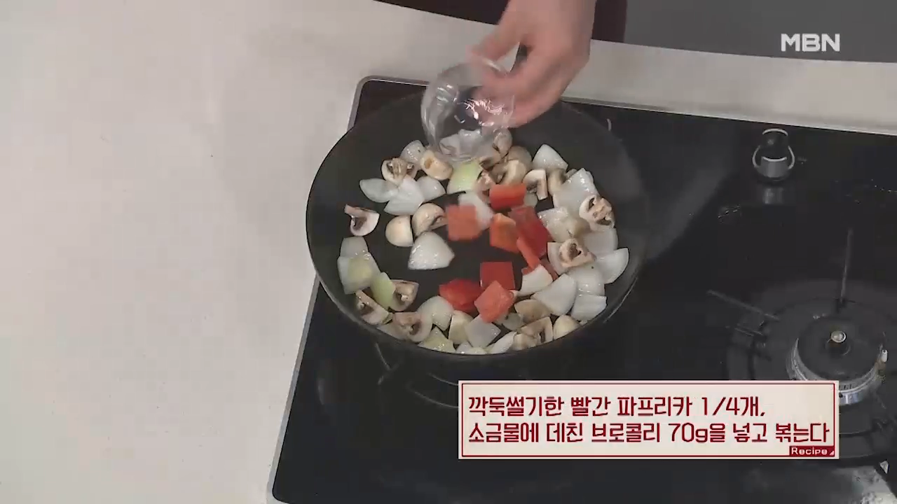 ▶깍둑썰기한 빨간 파프리카 1/4개, 소금물에 데친 브로콜리 70g을 넣고 볶아줍니다.