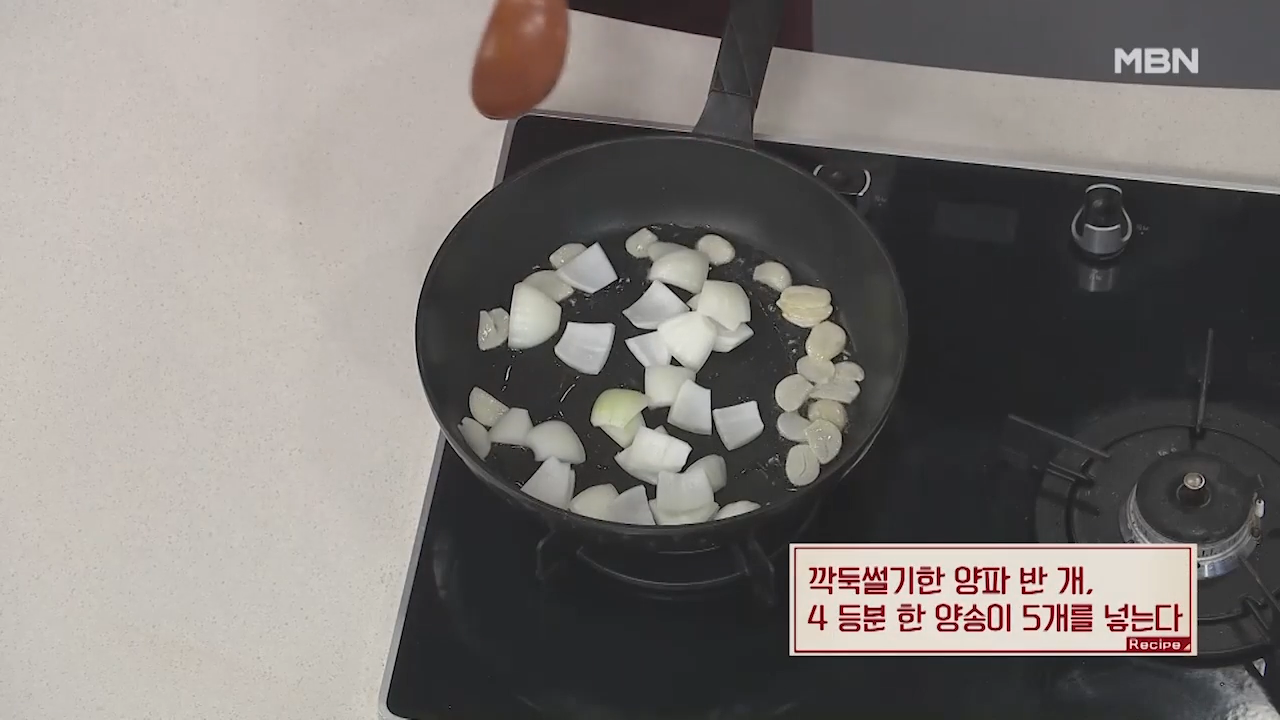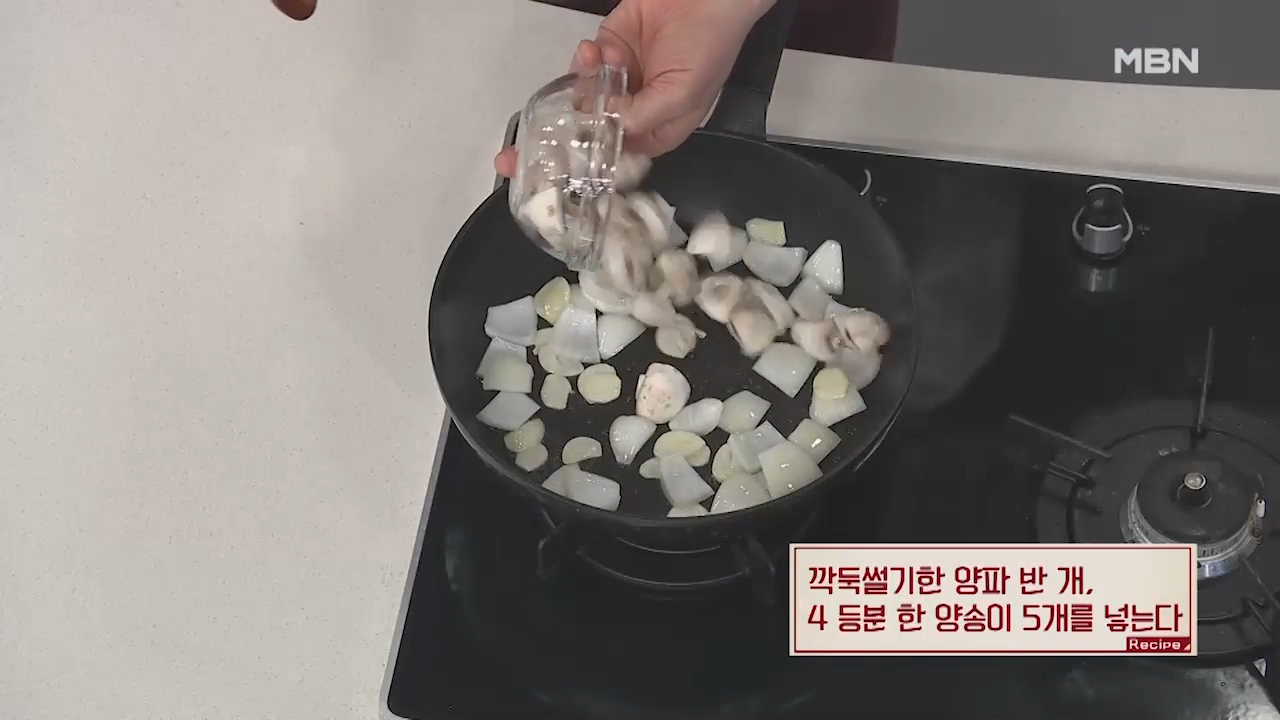 ▶깍둑썰기한 양파 반 개, 4등분 한 양송이 5개를 넣어줍니다.
