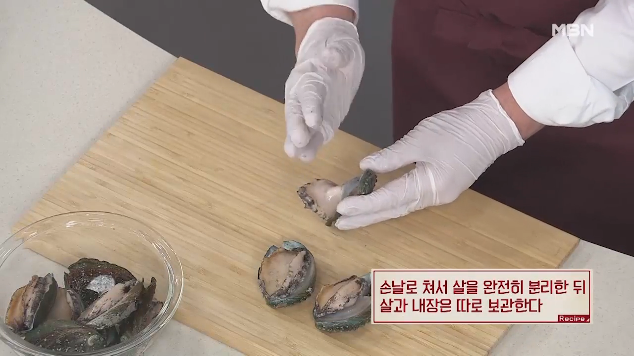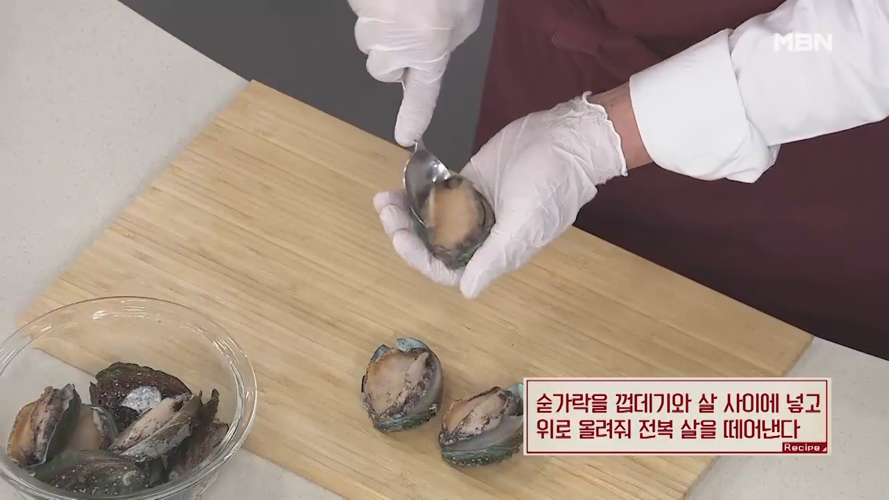 ▶숟가락을 껍데기와 살 사이에 넣고 위로 올려줘 전복 살을 떼어냅니다.