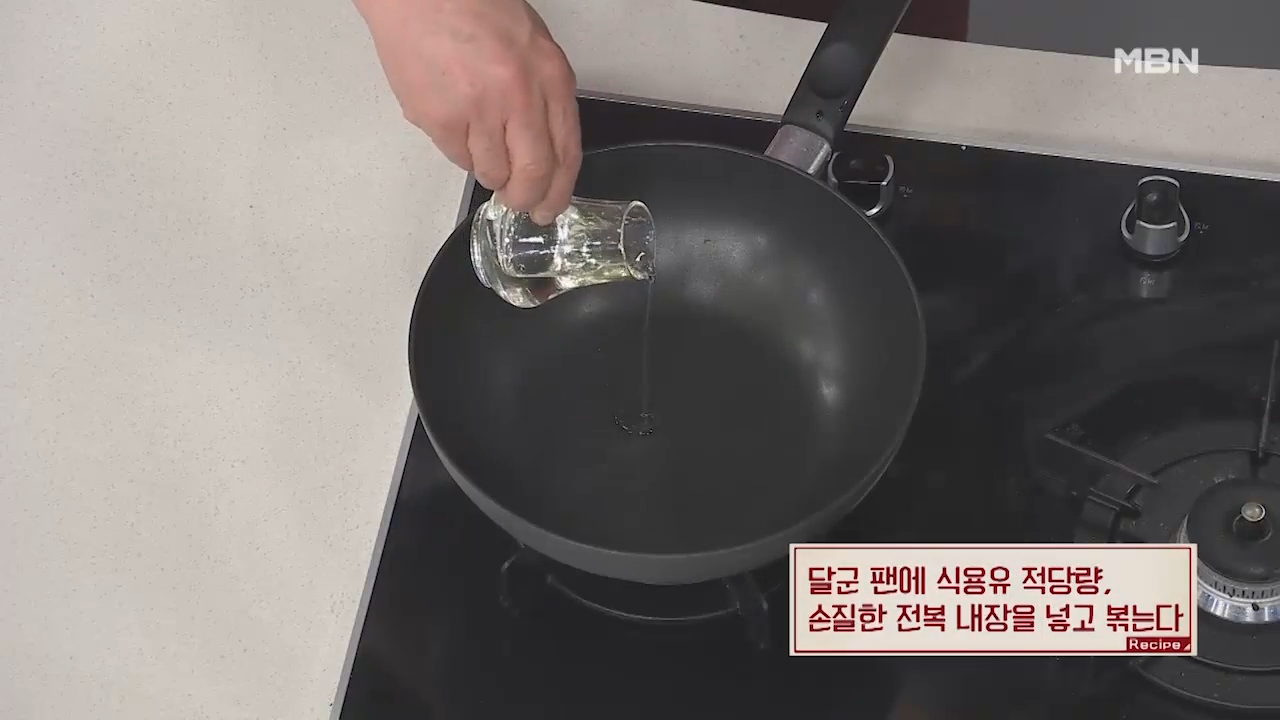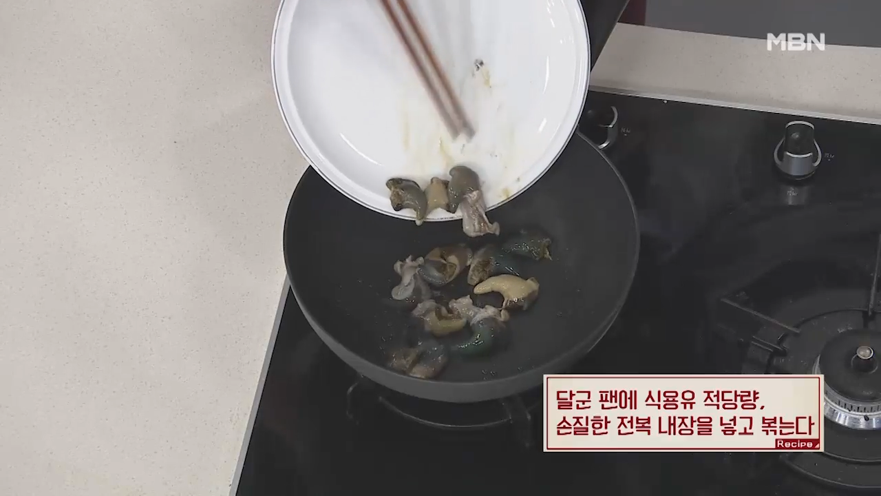 ▶달군 팬에 식용유 적당량, 손질한 전복 내장을 넣고 볶아줍니다.