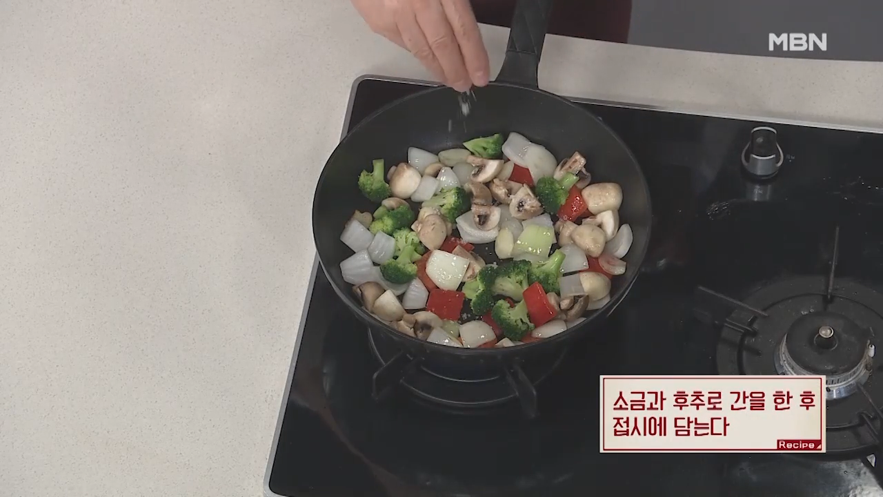 ▶후춧가루 적당량, 무염 버터 30g을 넣고 볶은 뒤 볶은 채소 위에 올려 줍니다.