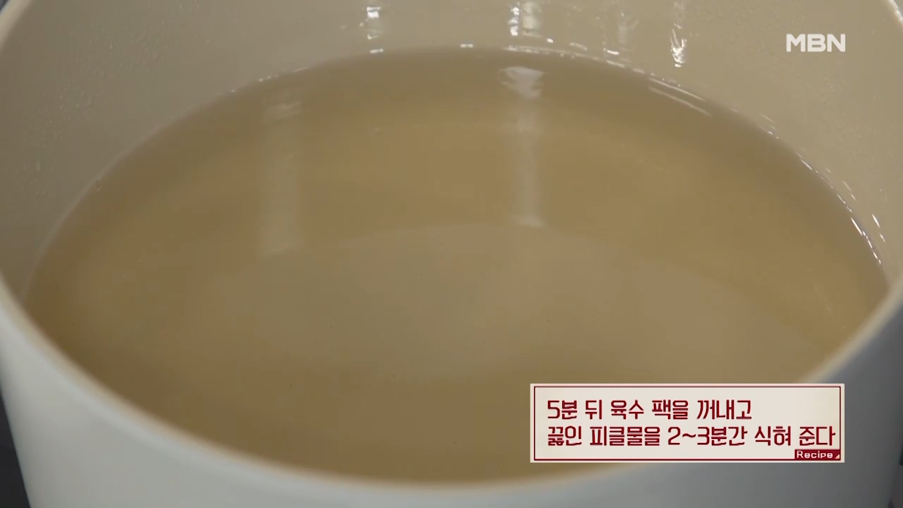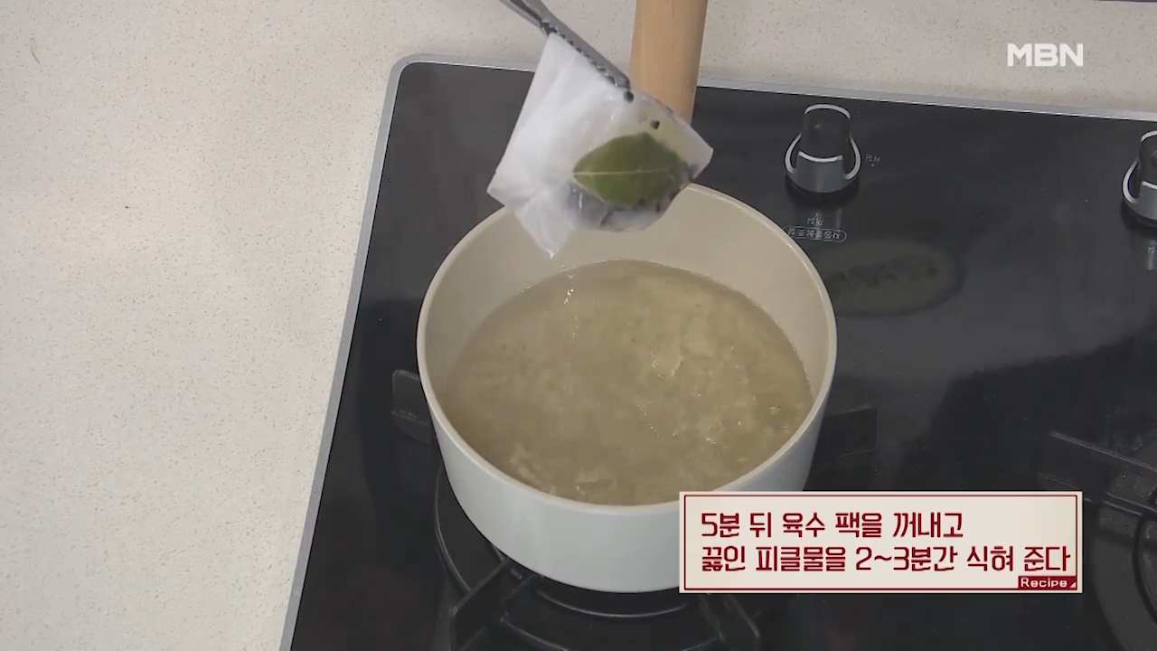▶5분 뒤 육수 팩을 꺼내고 끓인 피클물을 2~3분간 식혀 줍니다.