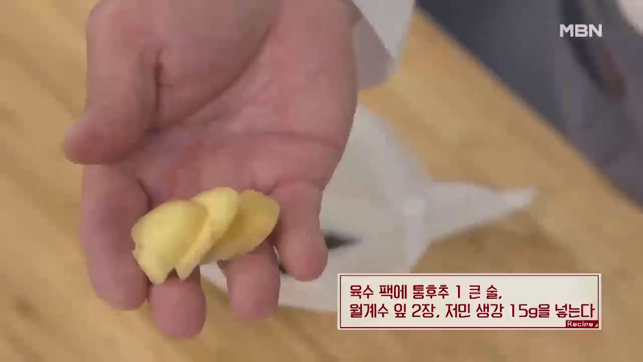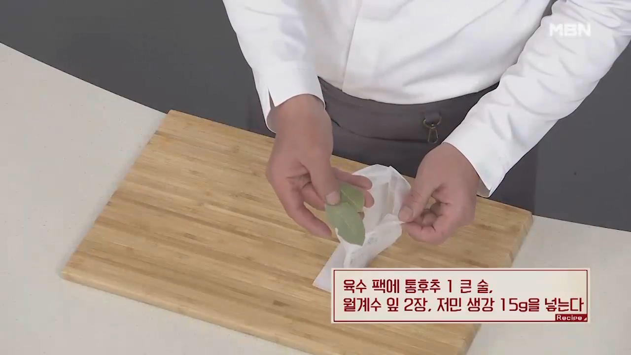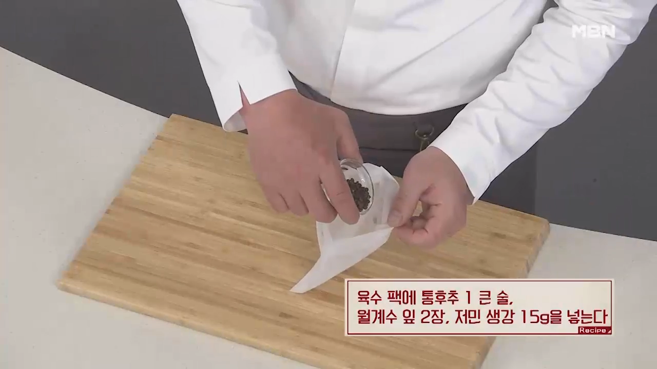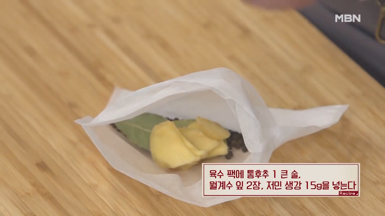 ▶육수 팩에 통후추 1큰술, 월계수 잎 2장, 저민 생강 15g을 넣어 줍니다.