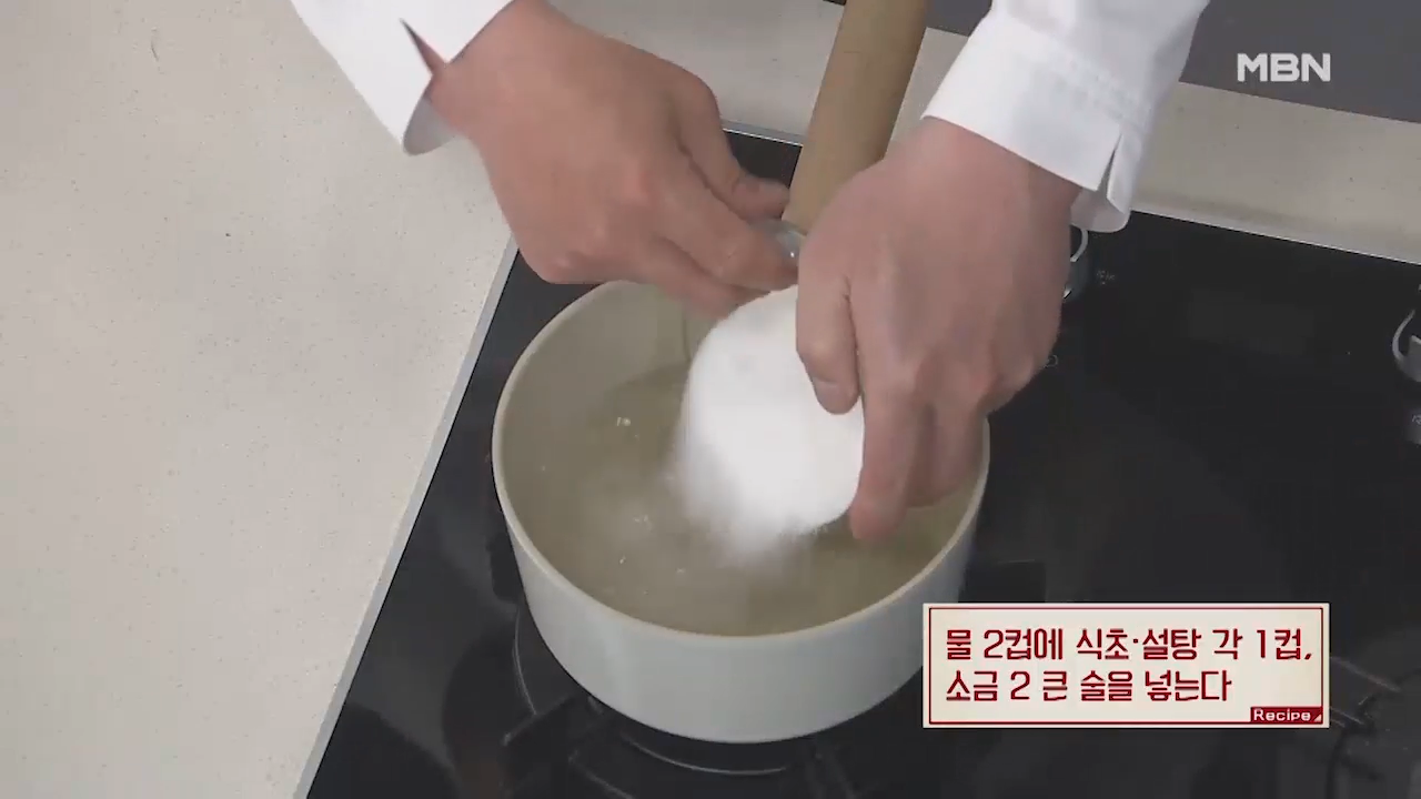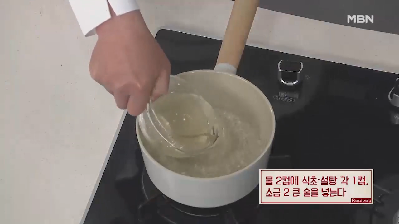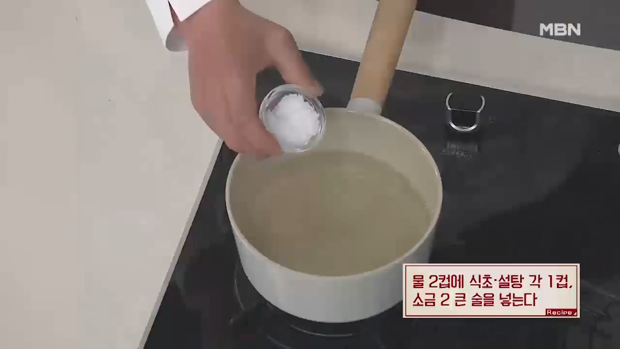 ▶물 2컵에 식초 1컵, 설탕 1컵, 소금 2큰술을 넣어 줍니다.
