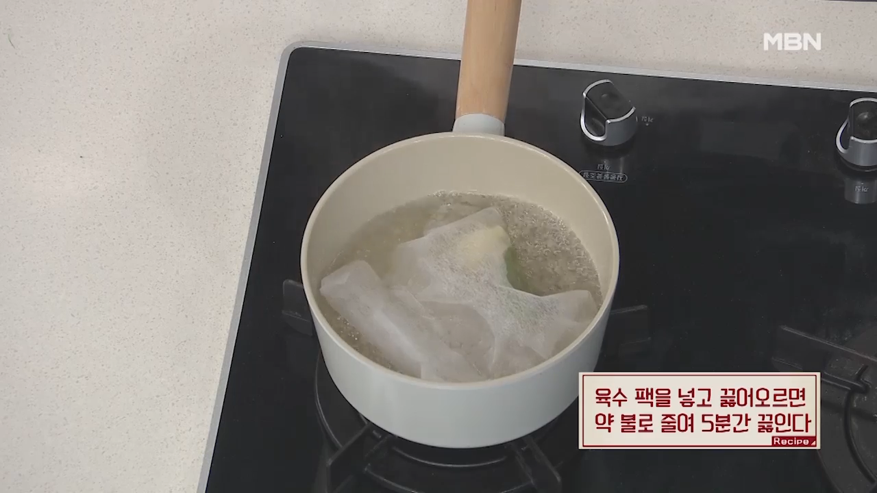 ▶육수 팩을 넣고 끓어오르면 약 불로 줄여 5분간 끓여 줍니다.
