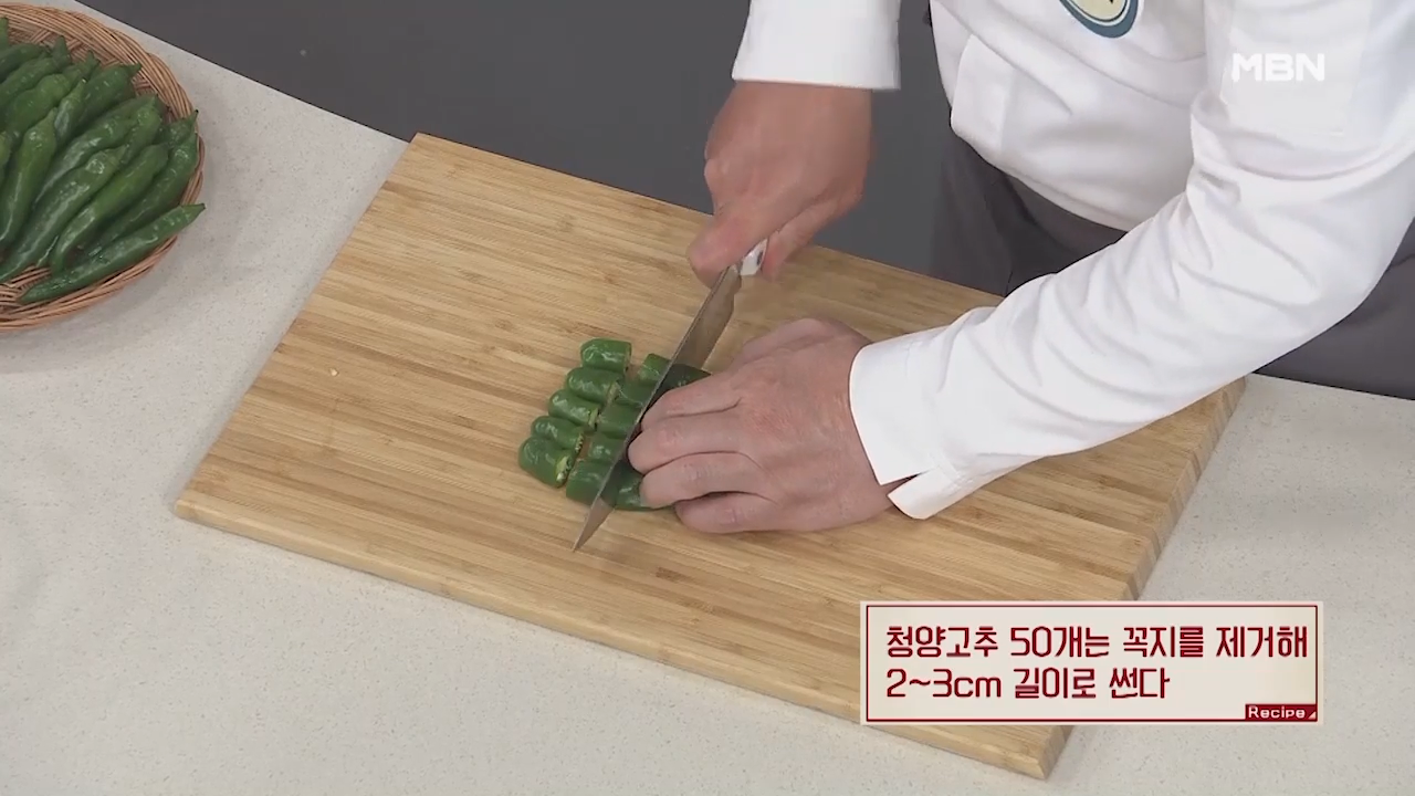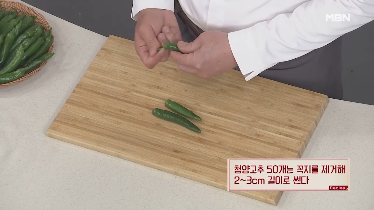 ▶청양고추 50개는 꼭지를 제거해 2~3cm 길이로 썰어줍니다.
