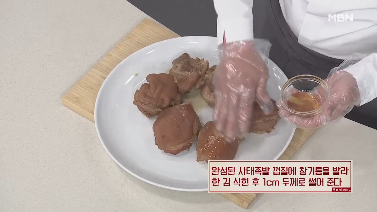 ▶완성된 사태족발 껍질에 참기름을 발라 한 김 식힌 후 1cm 두께로 썰어 줍니다.