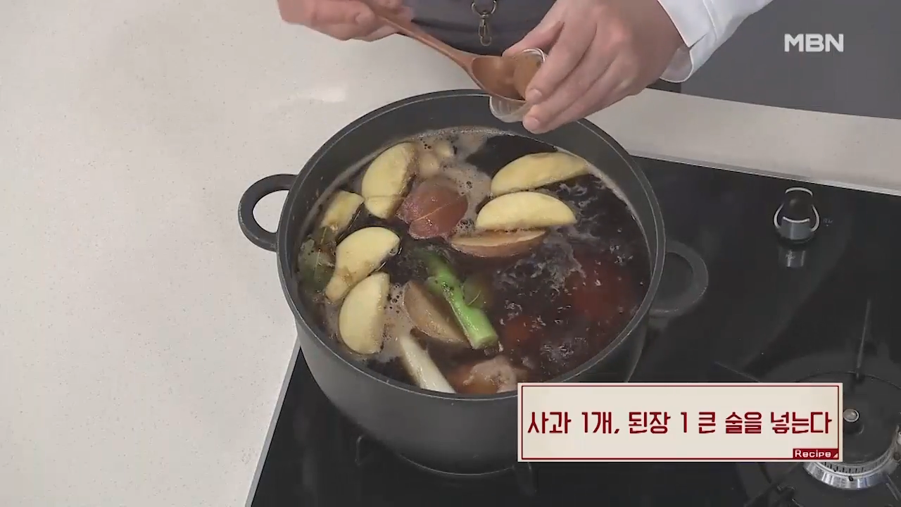 ▶사과 1개, 된장 1 큰술을 넣어줍니다.