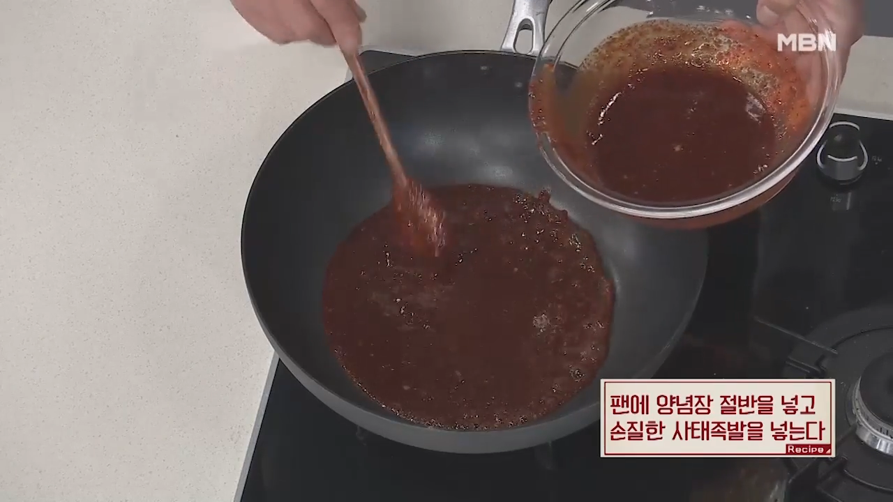 ▶팬에 양념장을 절반만 넣어 줍니다.