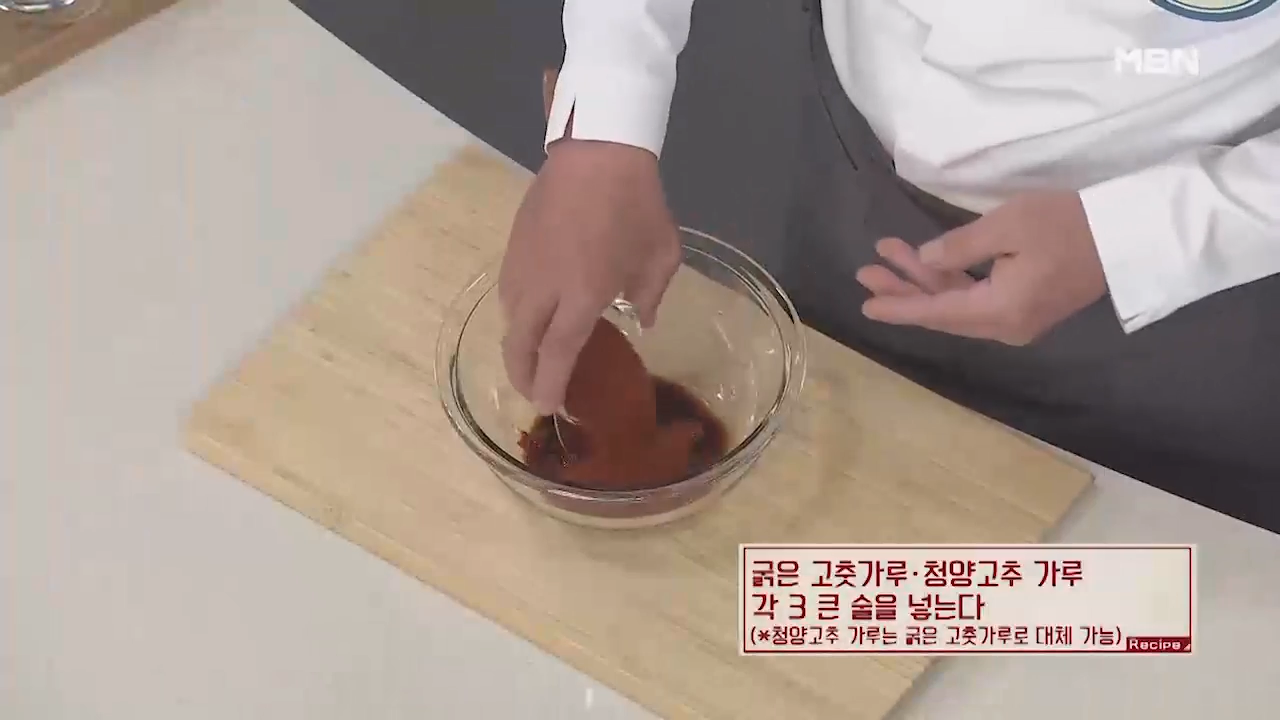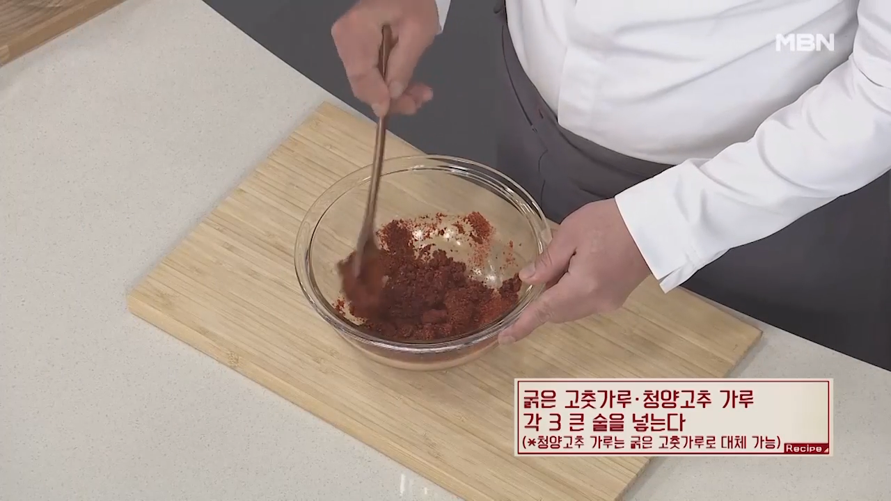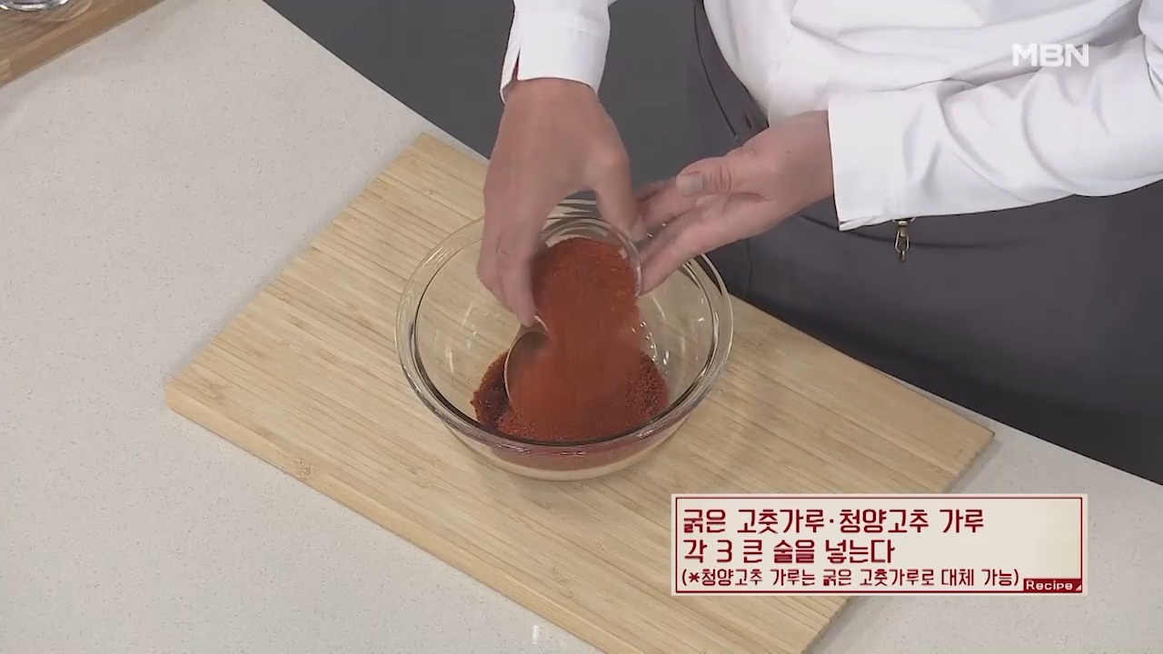 ▶굵은 고춧가루, 청양 고춧가루 각 3큰술을 넣어 줍니다. 청양 고춧가루는 굵은 고춧가루로 대체가 가능합니다.