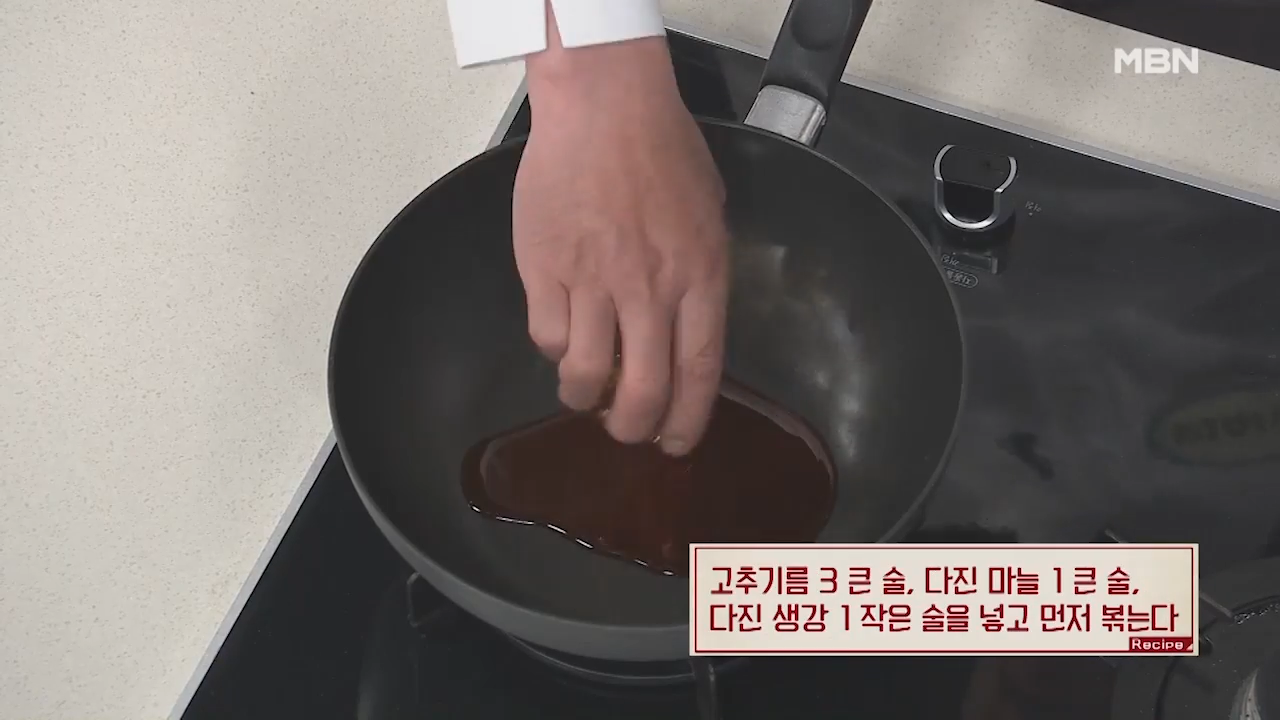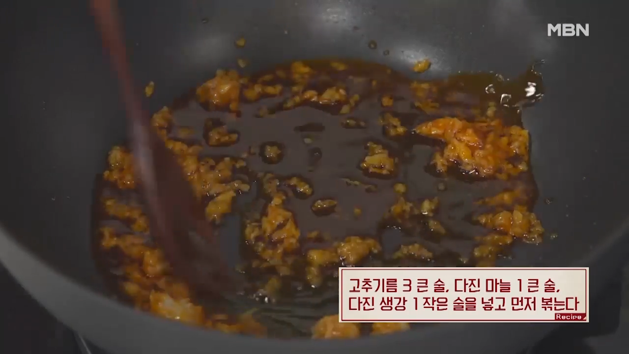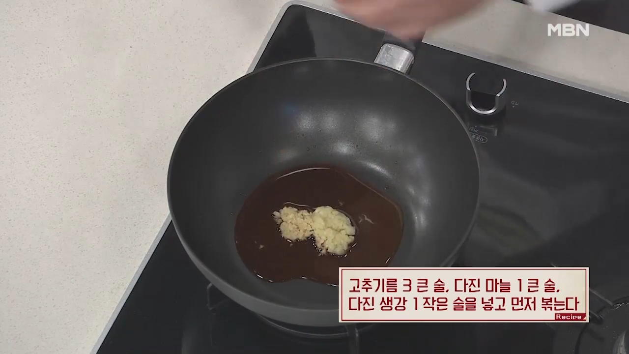 ① 고추기름, 다진 마늘, 다진 생강 넣기