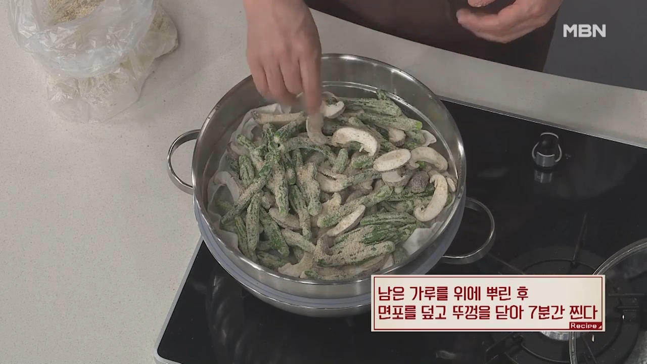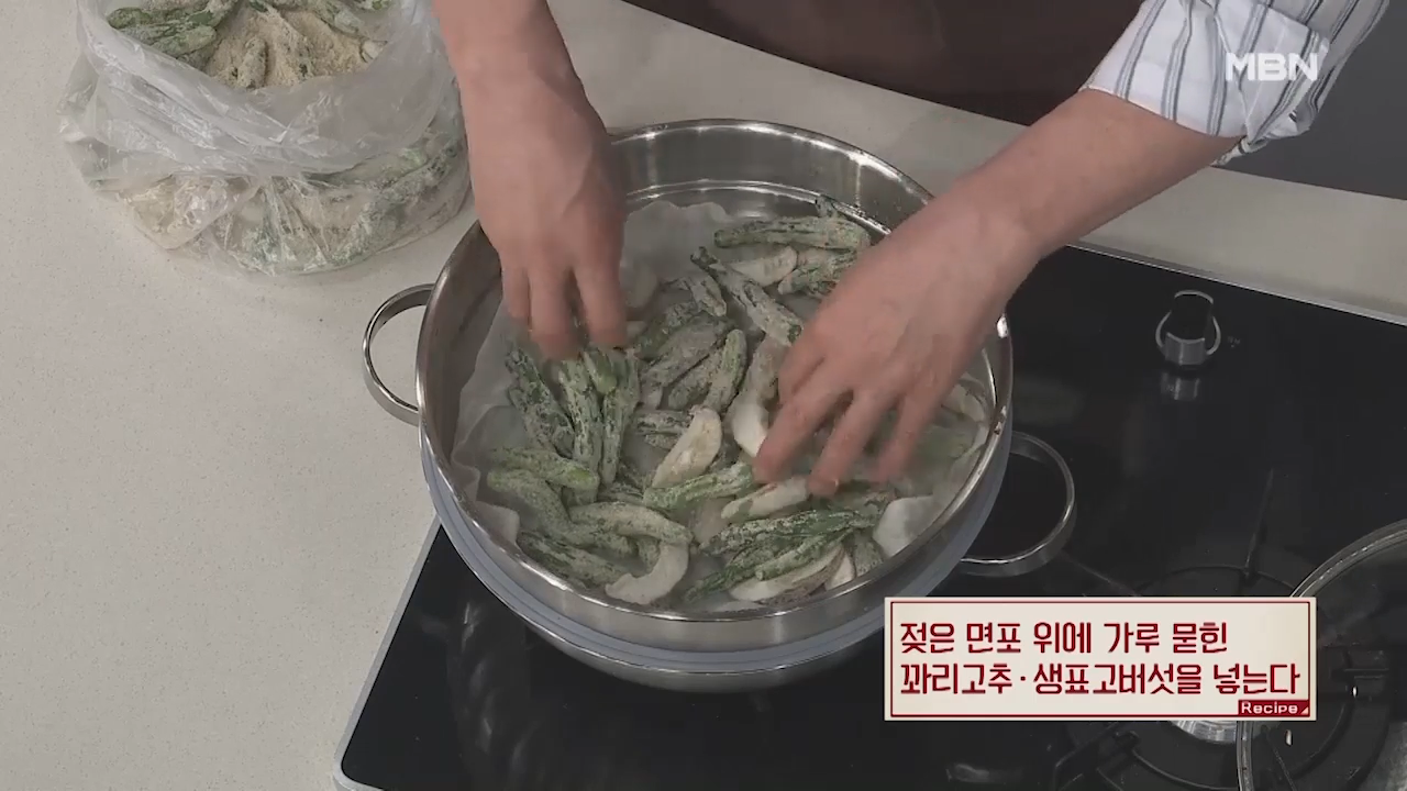 ▶젖은 면포 위에 가루 묻힌 꽈리고추, 생표고버섯을 넣어 줍니다.