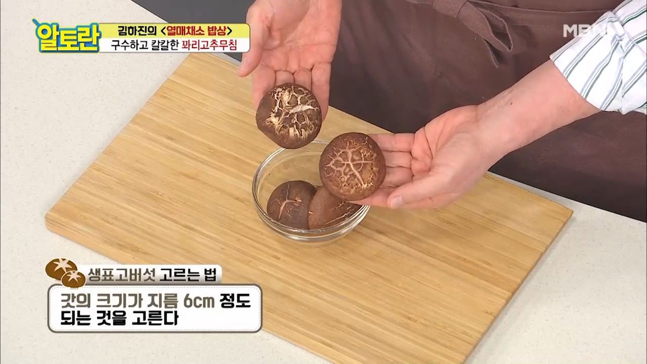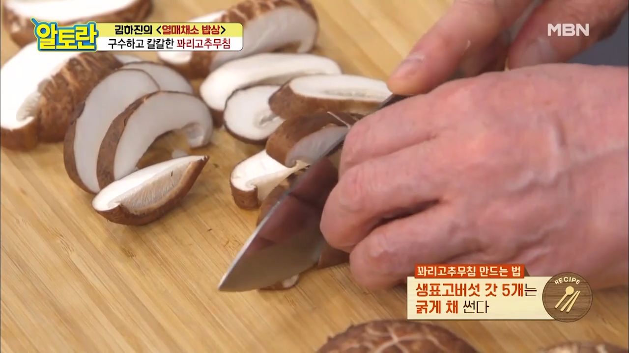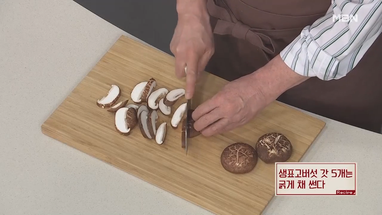 ▶생표고버섯갓 5개는 굵게 채를 썰어 줍니다. 꽈리고추의 두께 비슷하게 썰어 줍니다.