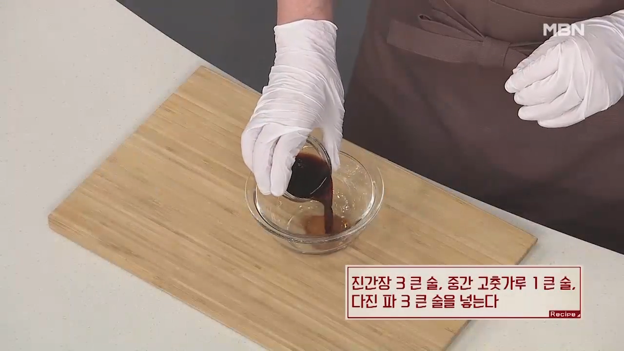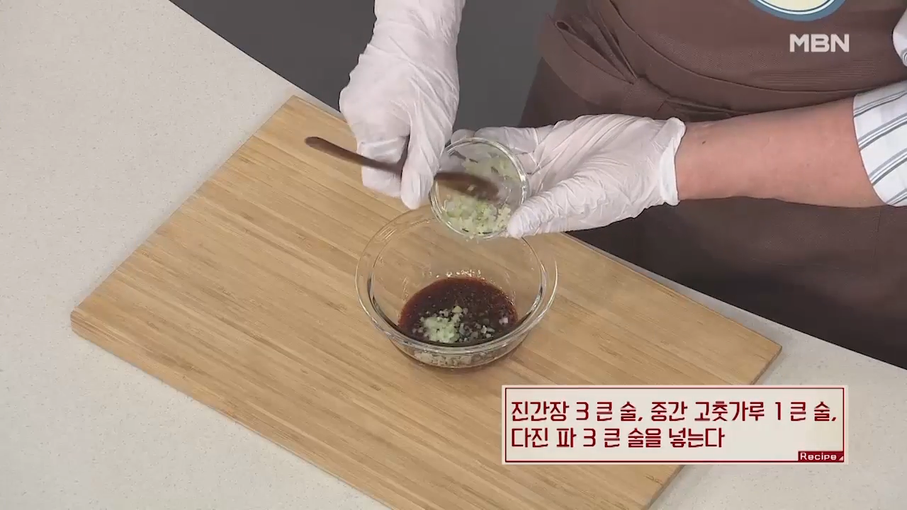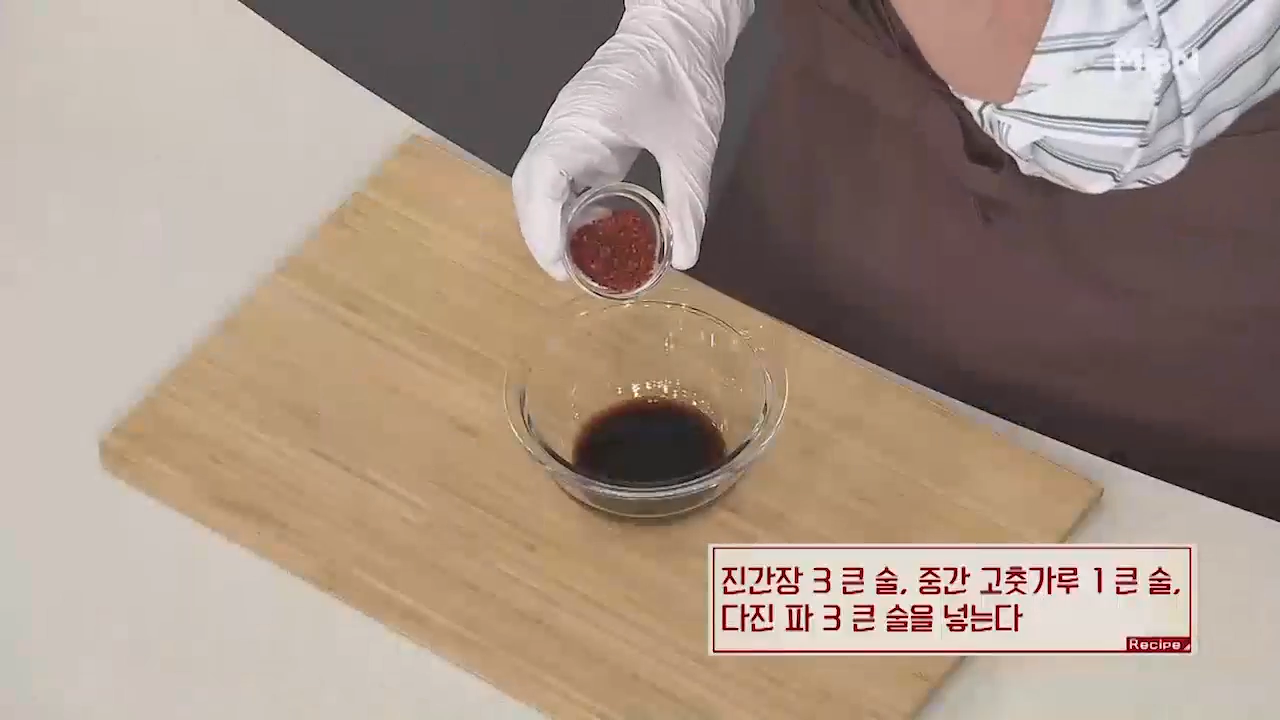 ① 진간장, 중간 고춧가루, 다진 파 넣기